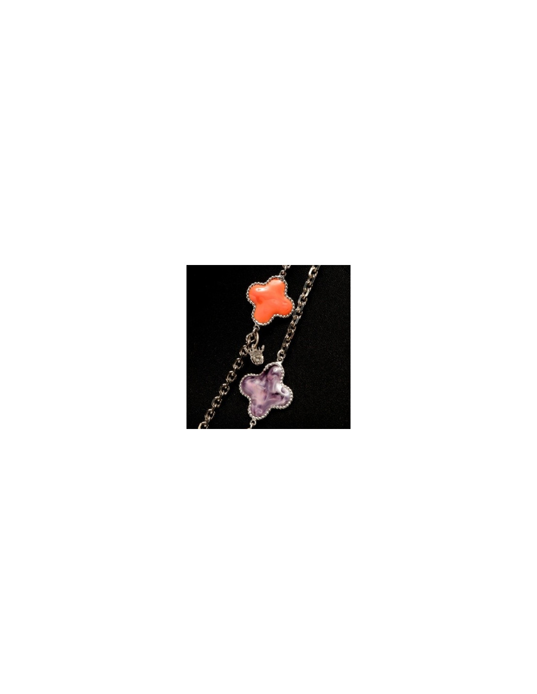 Superbe sautoir double ou triple rangs, Marguerite de Valois. entre chaque chaîne, un trèfle stylisé soit orange, soit mauve mêlé en pâte de verre entièrement réalisé à la main dans nos ateliers.