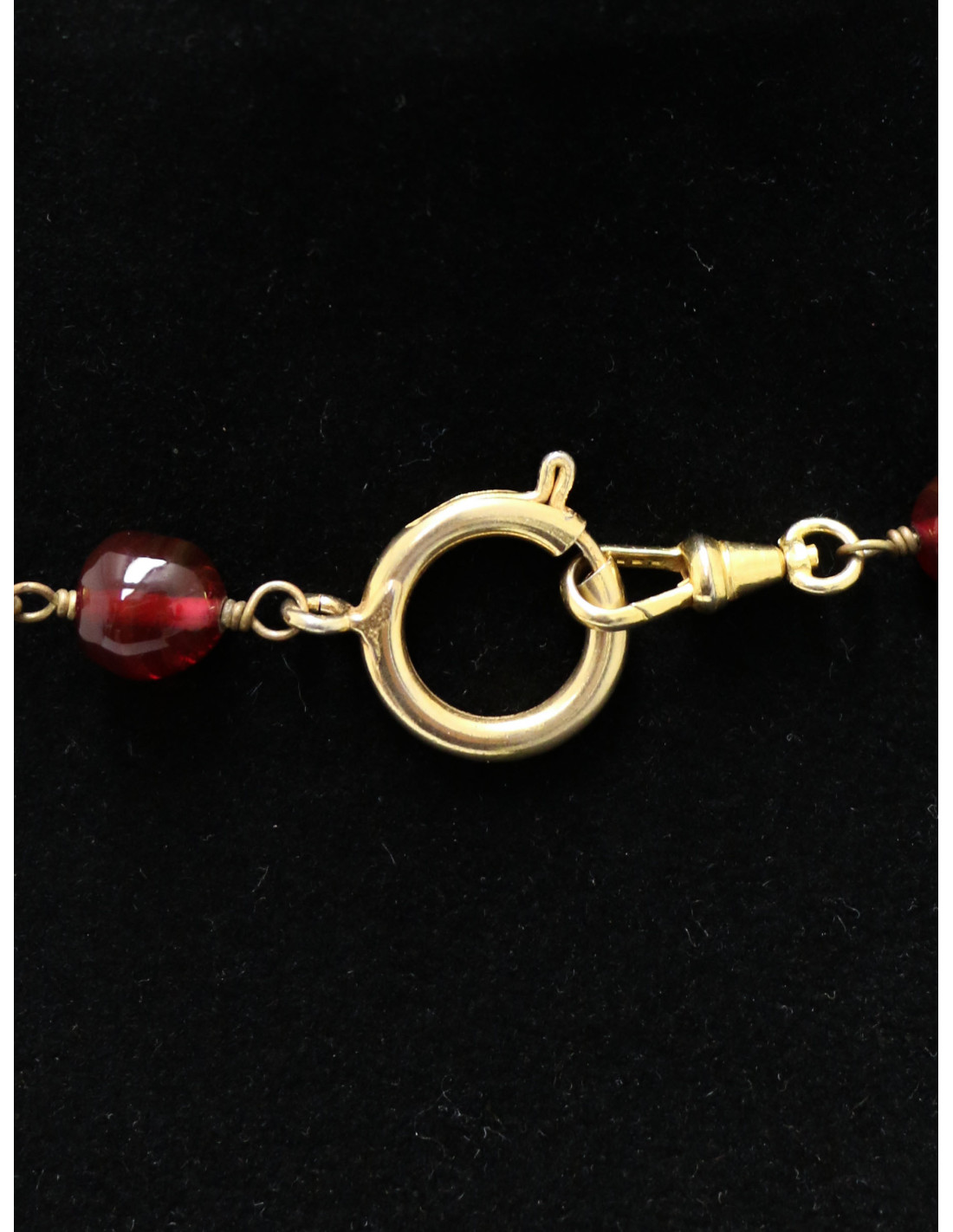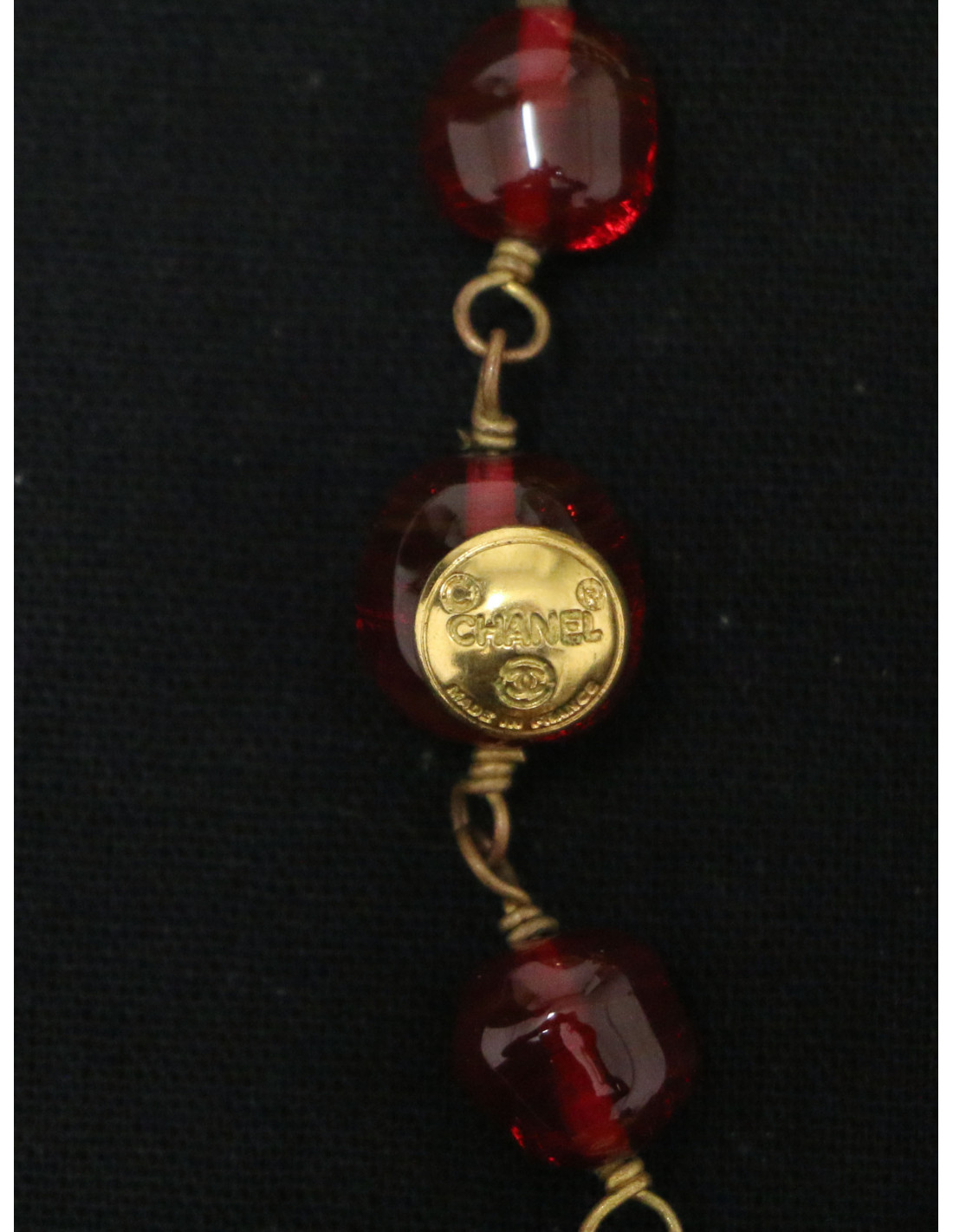 Détails : sautoir composé de perles en pâte de verre rouge rubis et de petits logo CC ronds dorés.