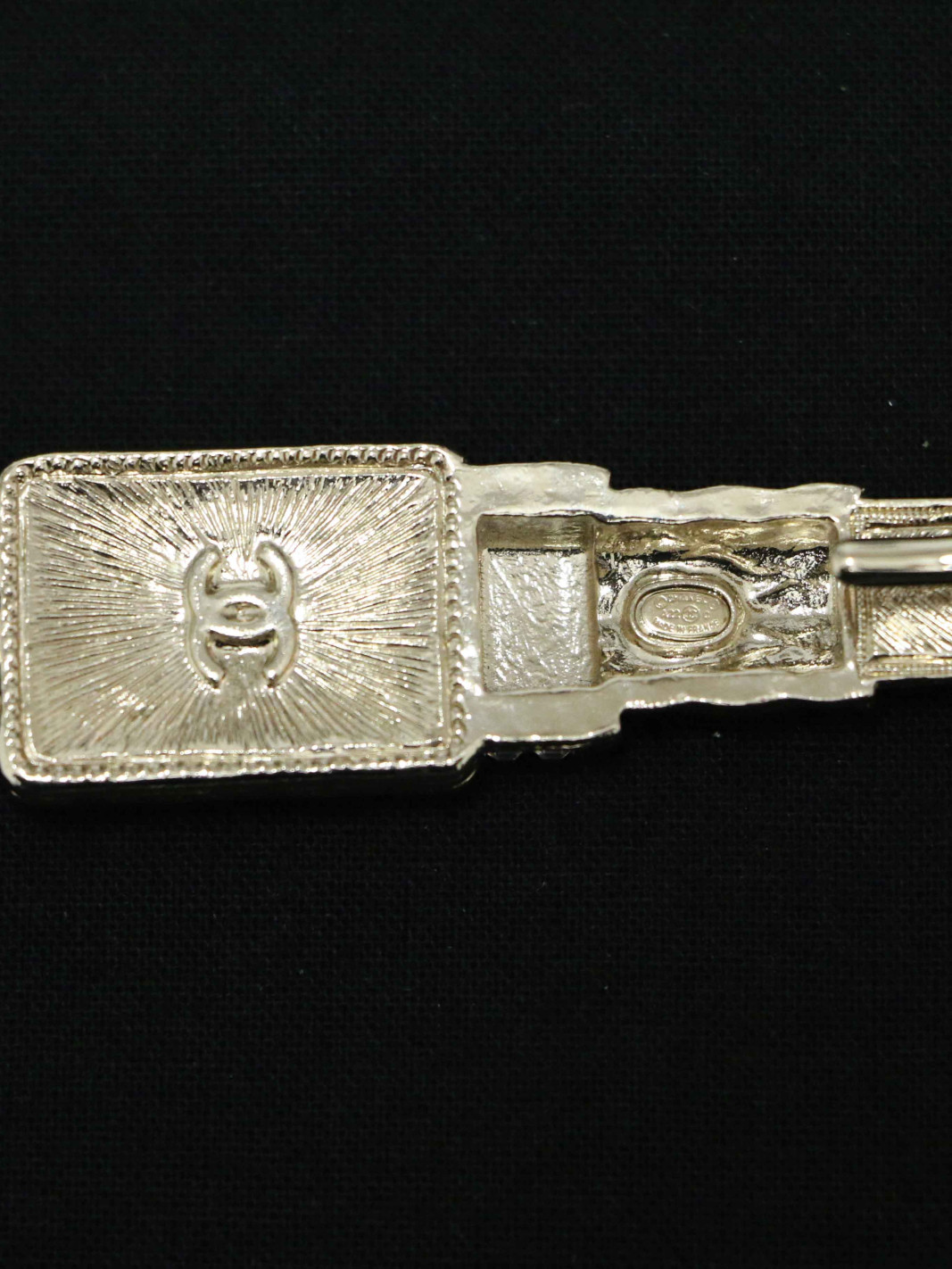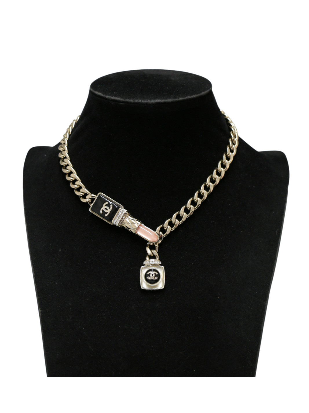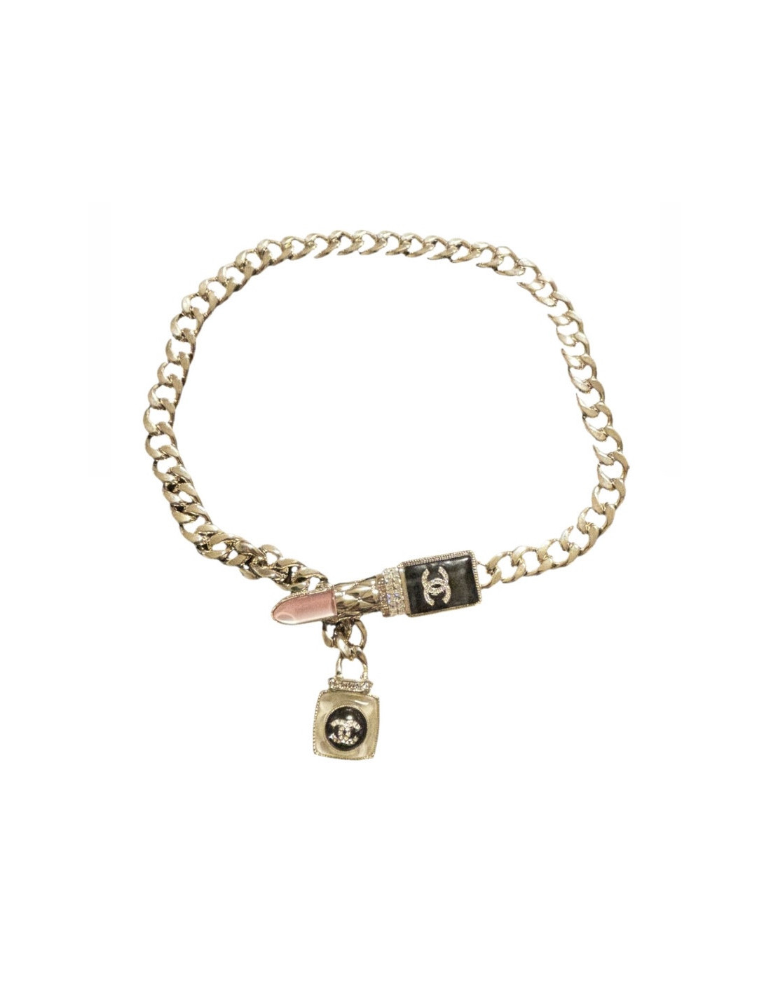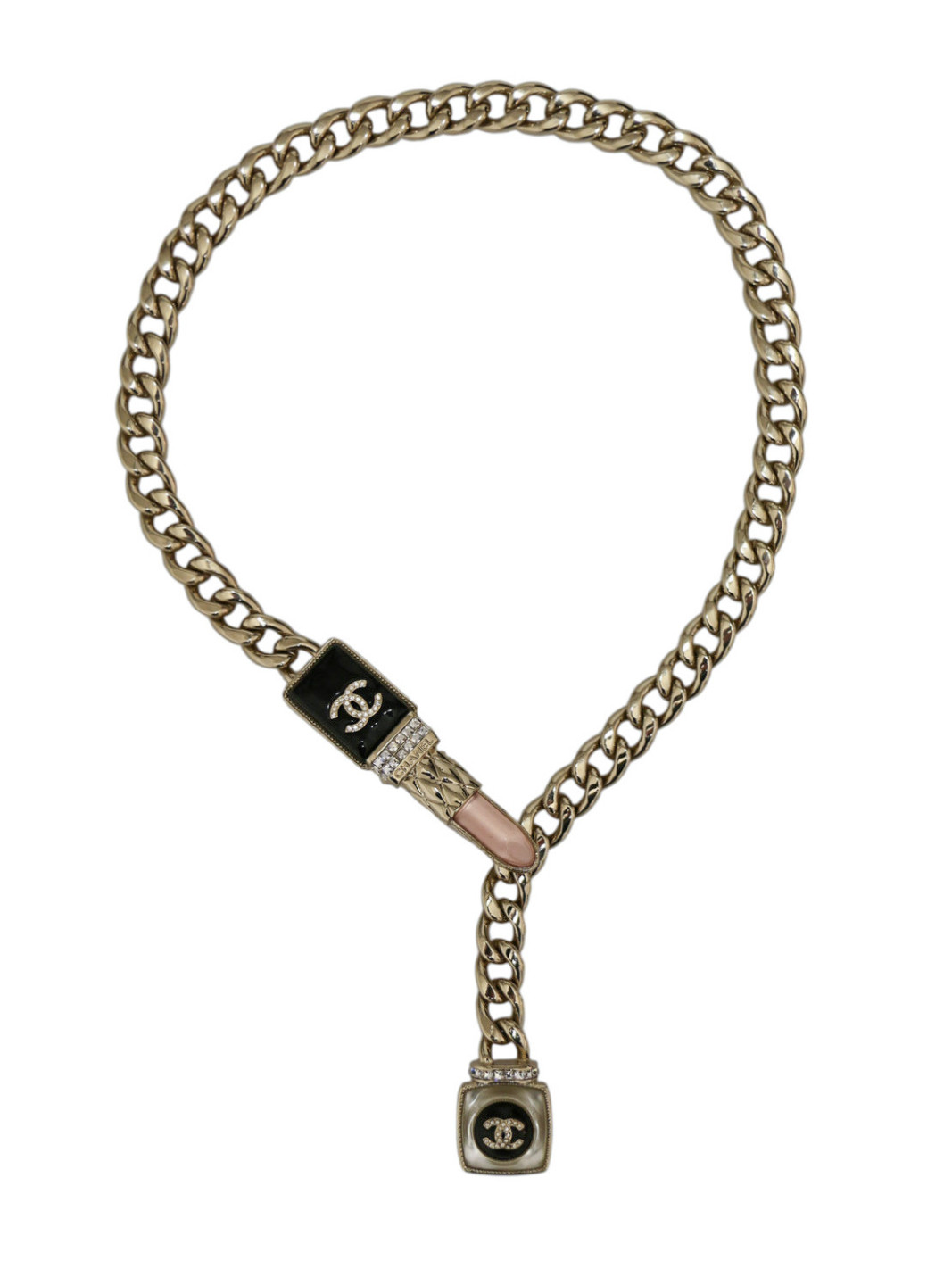 Détails : ce collier raffiné de Chanel incarne un luxe à la fois ludique et emblématique de la Maison. Cette pièce contemporaine se distingue par son pendentif central en forme de rouge à lèvres, ornée du logo CC rehaussé de cristaux scintillants. Un deuxième pendentif vient terminer la deuxième extrémité; la firme de celui-ci rappelle la célèbre bouteille du parfum Numéro 5.