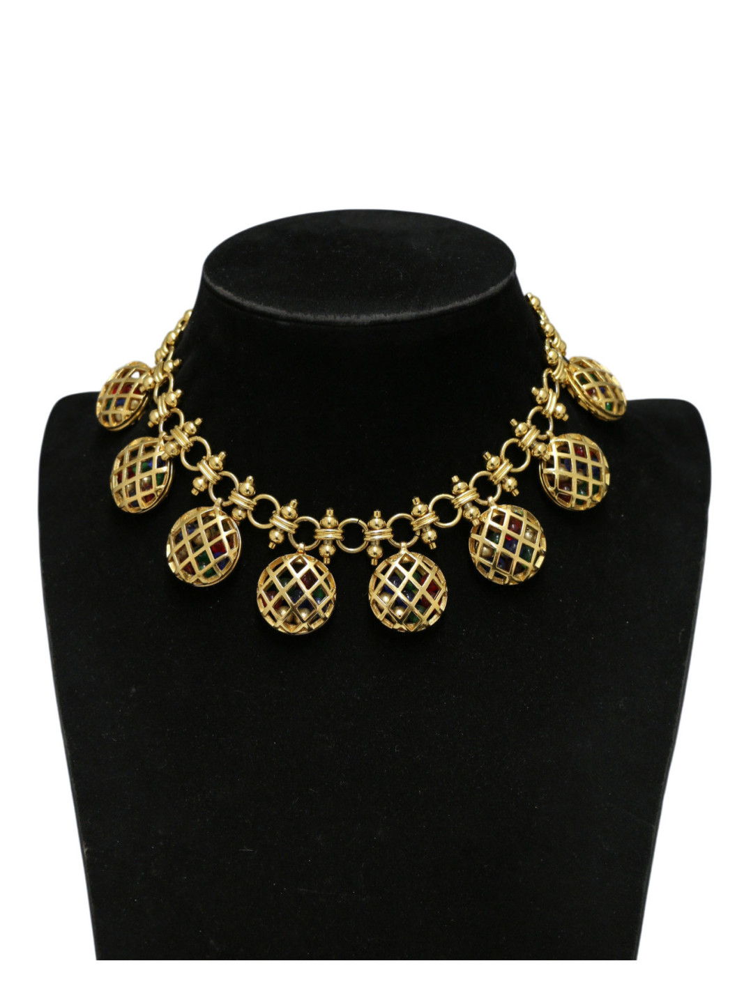 Découvrez ce collier Chanel vintage en métal doré, une pièce forte des années 1970-1980, qui reflète parfaitement le style audacieux de la maison. Porté près du cou, il apporte immédiatement du caractère et structure la silhouette. La chaîne est composée de maillons travaillés, ornés de breloques en forme de sphères ajourées. À l’intérieur, de petites perles aux tons rouge, vert et bleu créent un joli contraste et donnent du mouvement à l’ensemble. Pièce vintage en très bon état général, de légères marques sur certaines perles. Une belle pièce de collection, idéale pour les amateurs de bijoux Chanel et de style vintage.