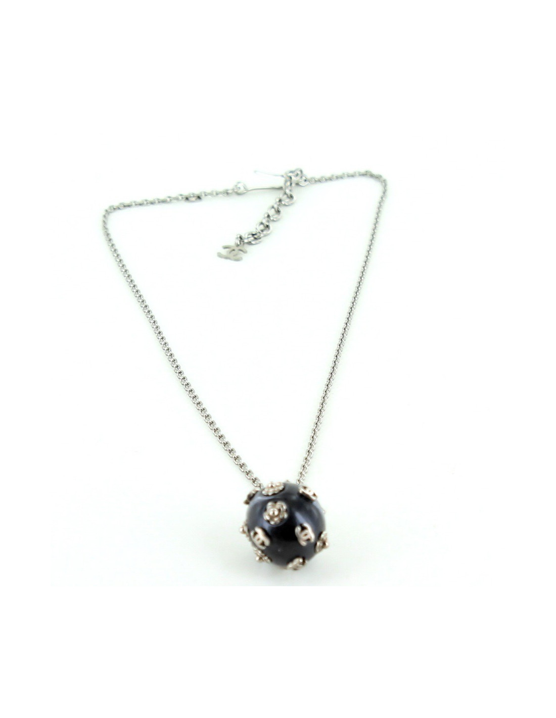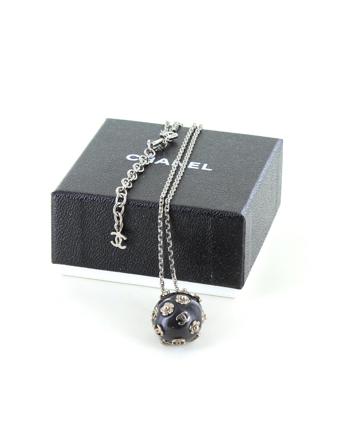 Collier Chanel sur une fine chaîne en métal argenté, se terminant par une boule sur laquelle sont greffés les camélias et des double C