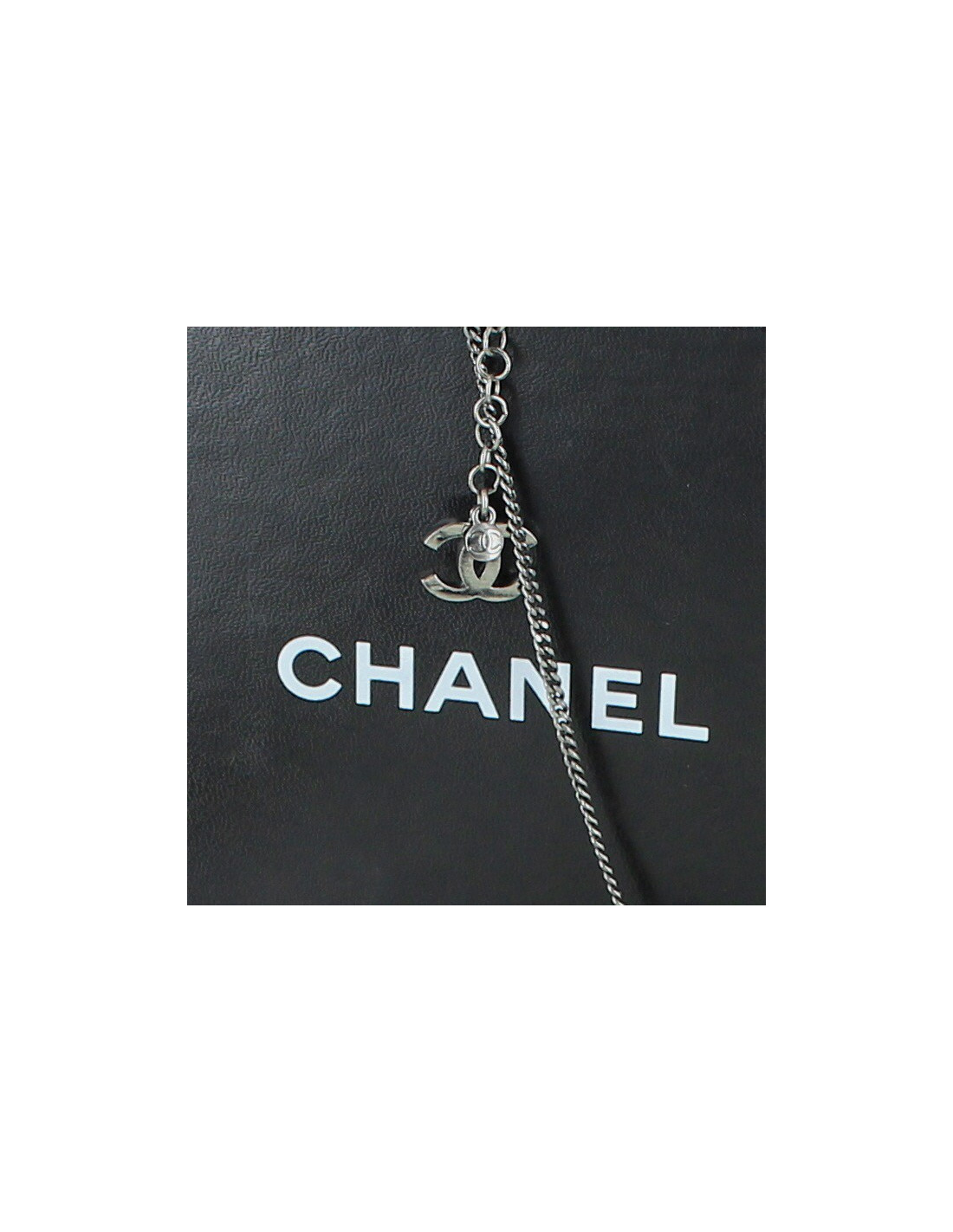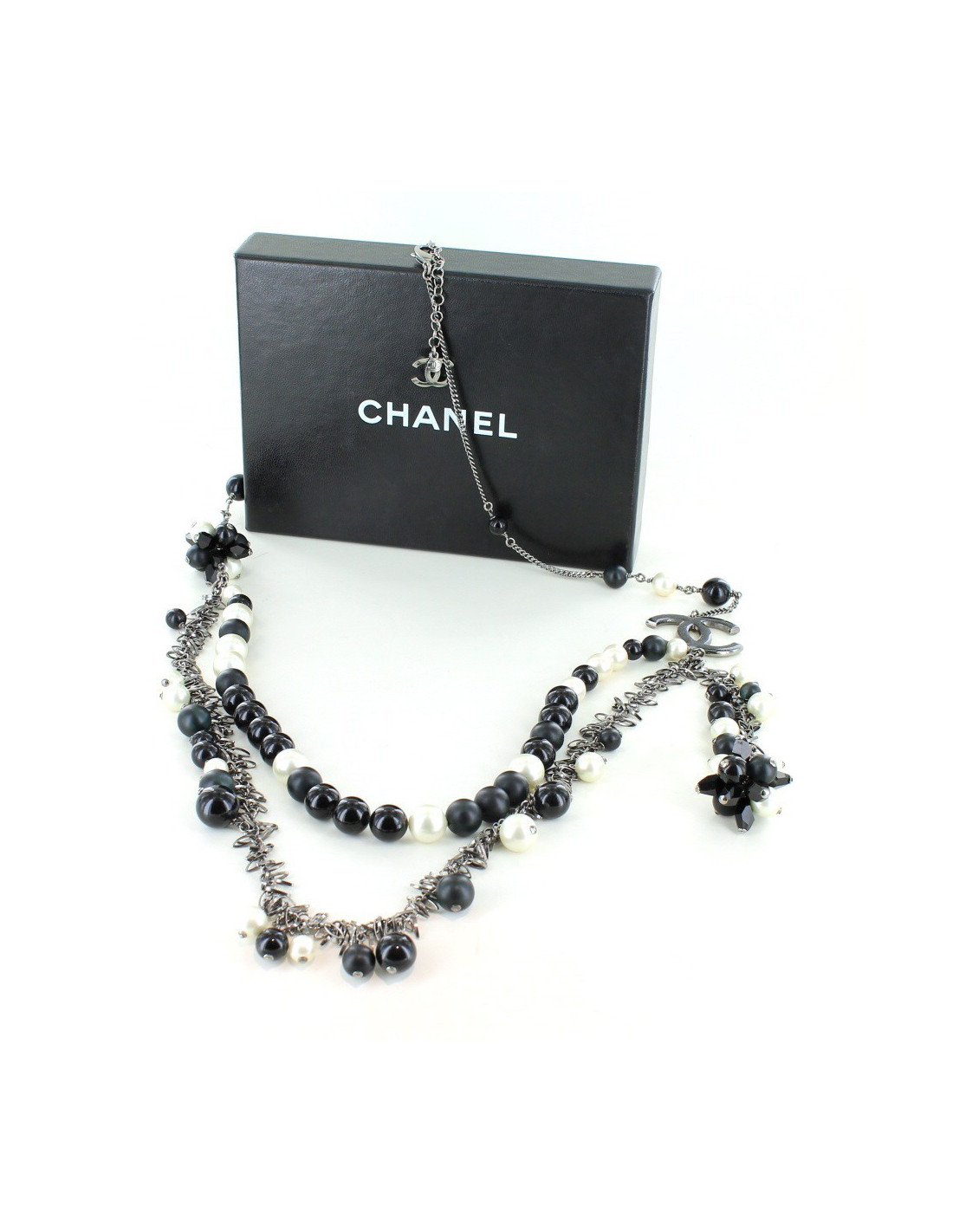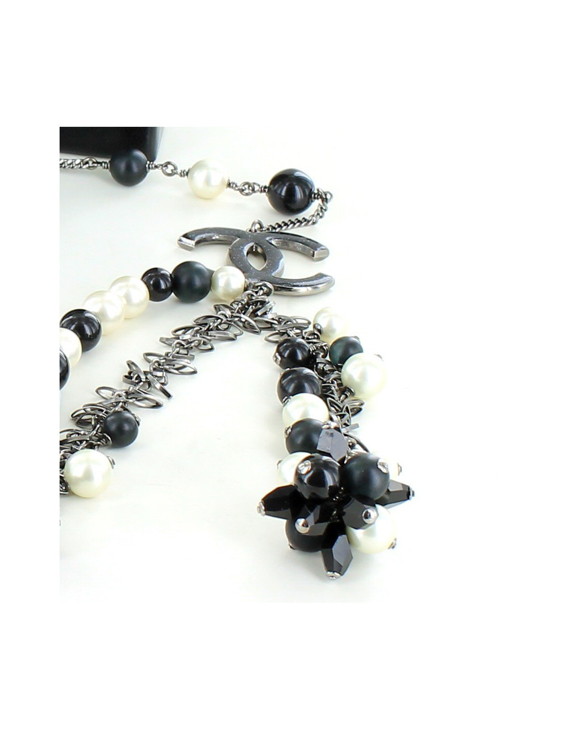 Sautoir Chanel, en perles noires brillantes et mat. et perles nacrées. Il est très fourni grâce a sa chaine originale et le grand double "C" ainsi que son double rang de perles.1 m