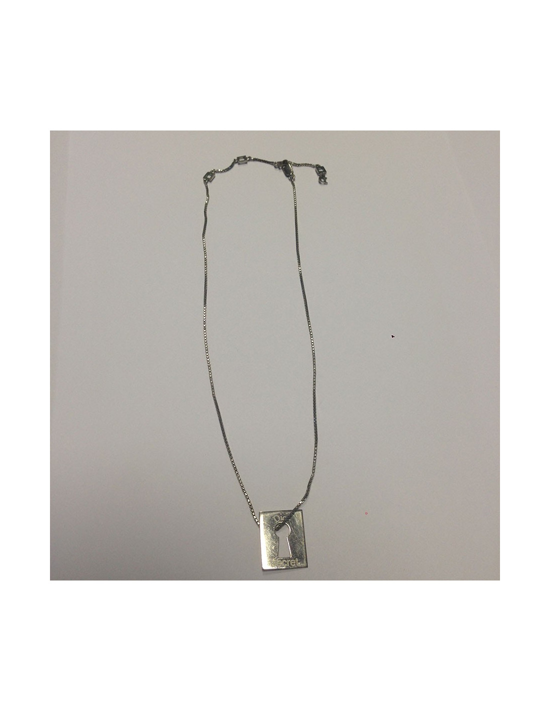Collier Dior avec un pendentif en forme de serrure avec deux inscriptions: "Dior" et "secret". Il est en palladium. En bon état. Quelques rayures sur le devant. Voir photos.