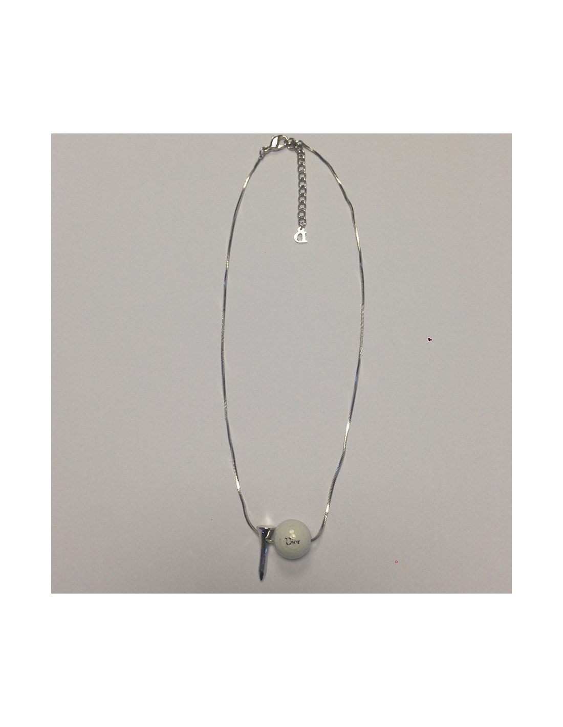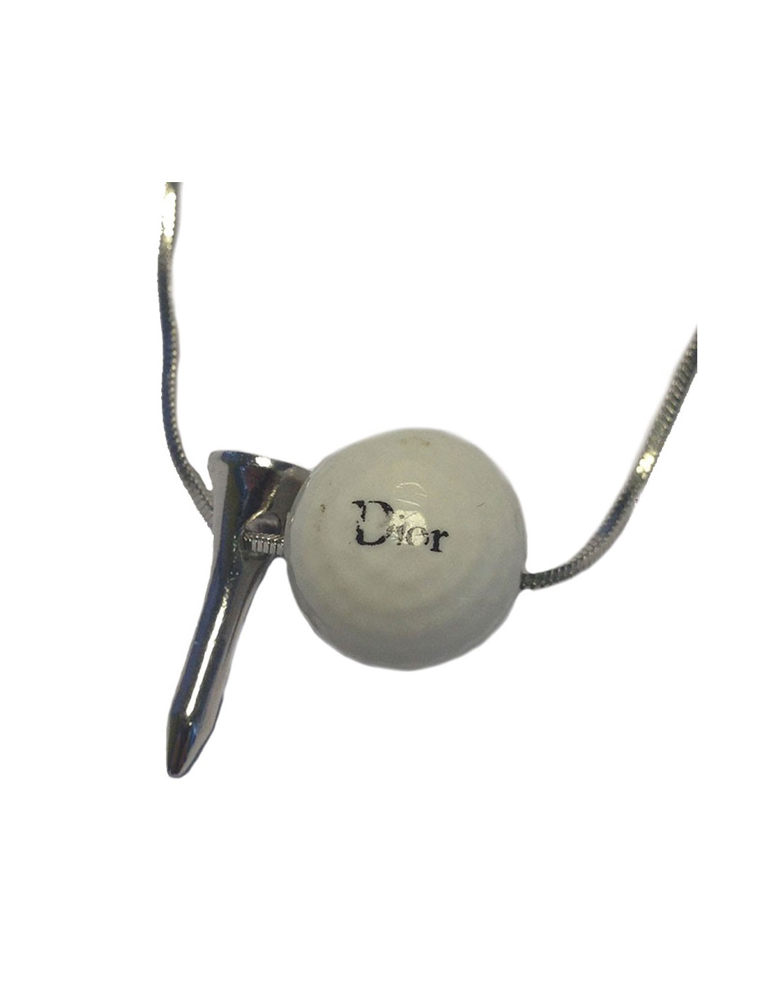 Collier "Balle de golf" de Dior. Il se comporte d'une balle de golf et d'un tee en métal argenté. En très bon état. L'insription "Dior" sur la balle s'éfface légèrement. Voir photos.