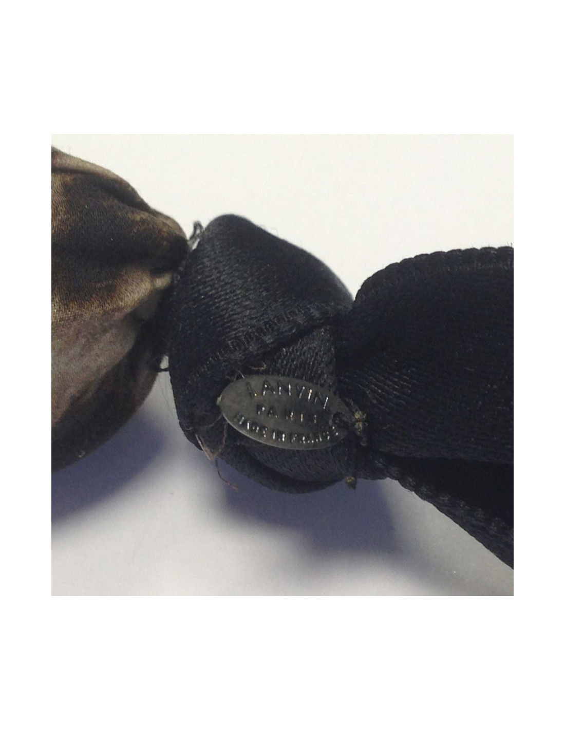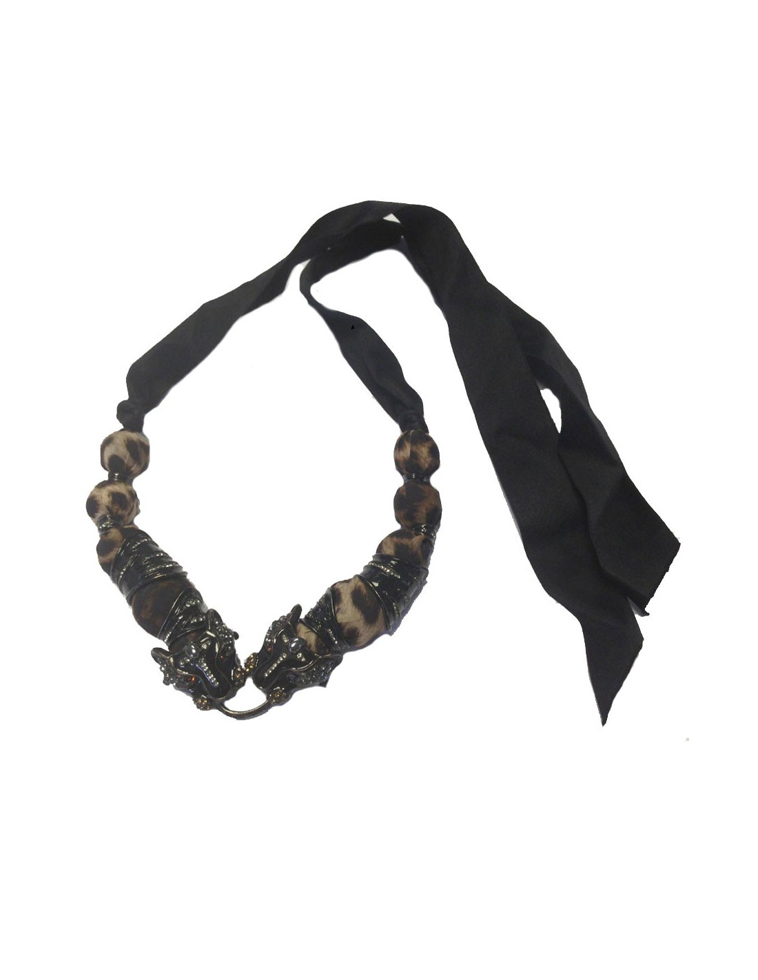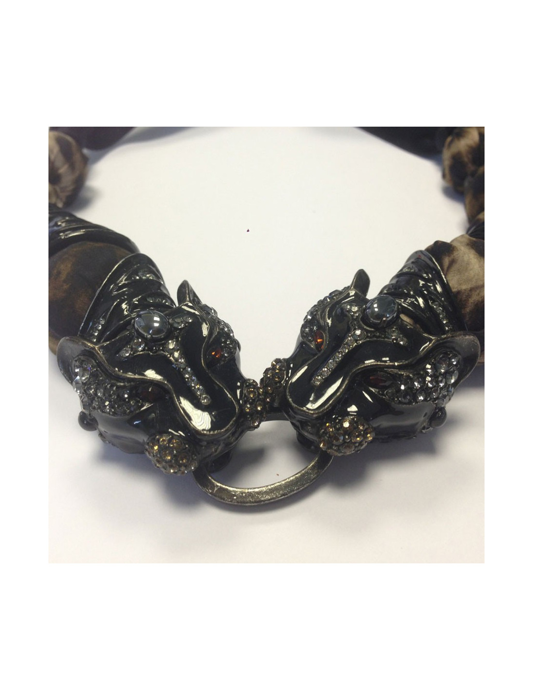 Superbe collier tête de panthère en résine noire, strass et ruban de la maison Lanvin. Attache en ruban gros grain noir satiné. Deux têtes de panthère reliées par un anneau et ornées de strass. Jamais porté.