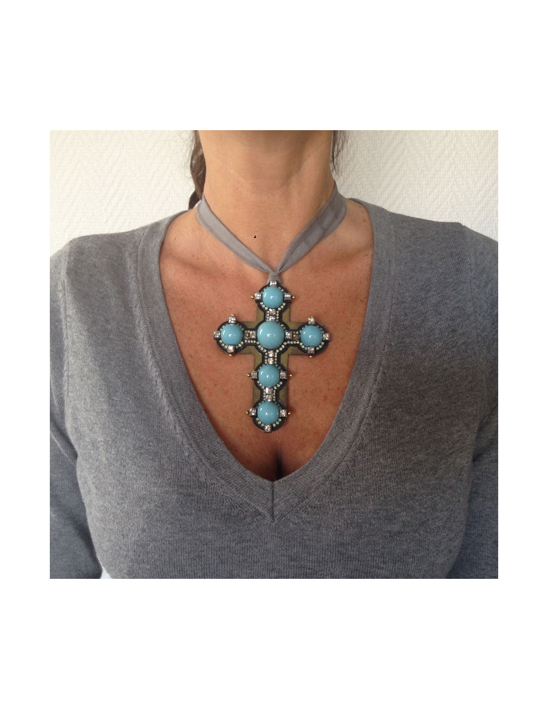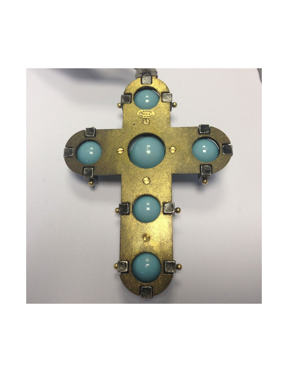 Superbe pendentif croix Lanvin en étain et cuivre vert de gris orné de six pierres turquoises et de strass de swarovski cristal. Attache ruban en coton gris. Très tendance. Jamais porté. Livré dans un joli pochon.