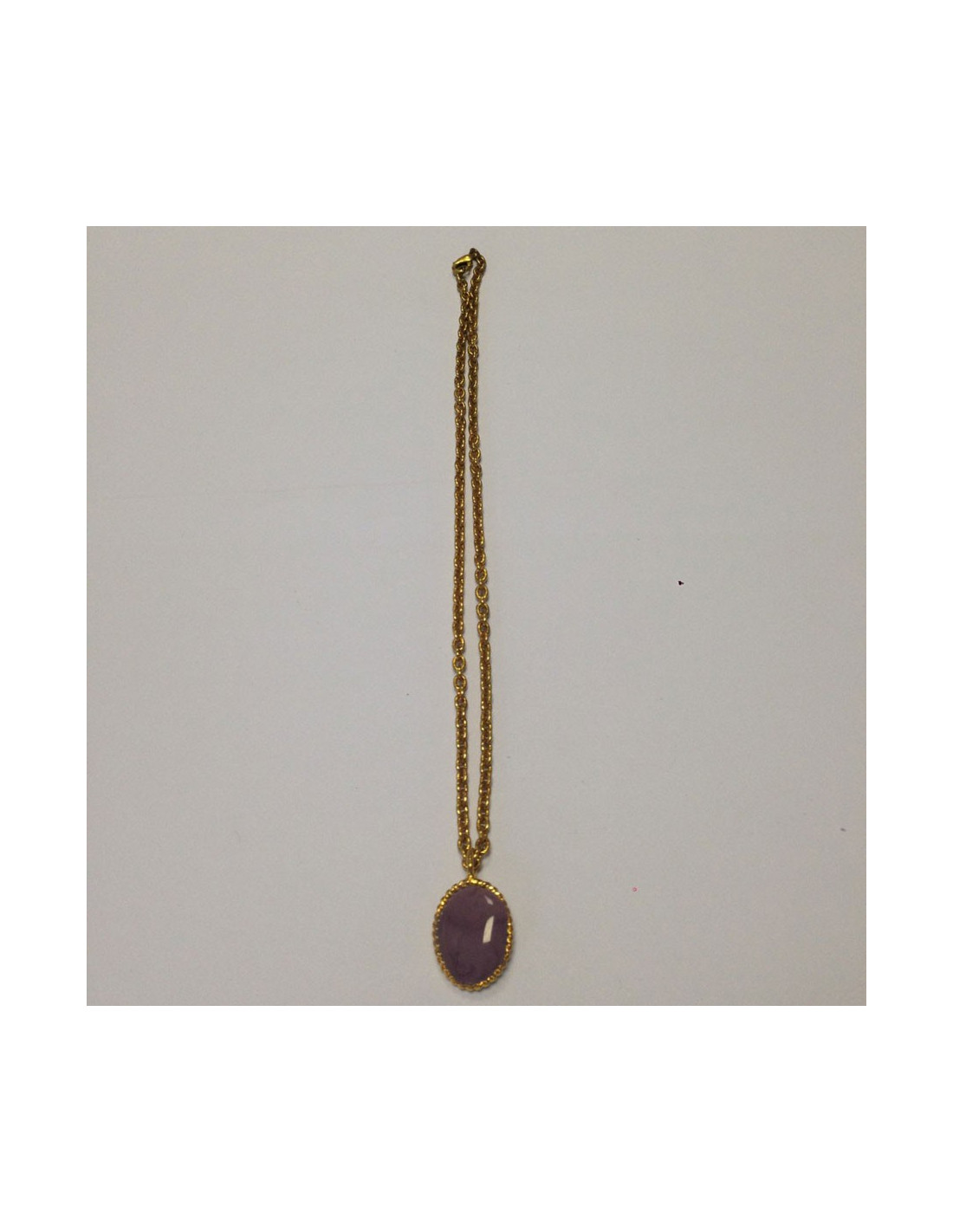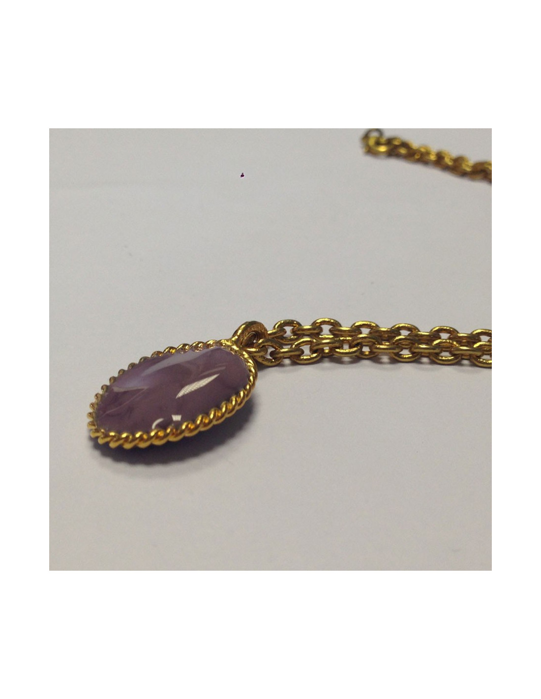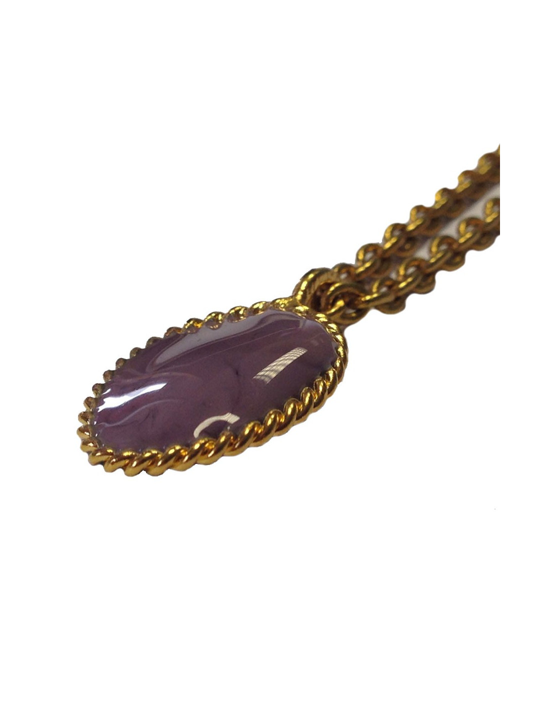 Collier Marguerite de Valois, cabochon parme en pâte de verre, monté sur chaîne en métal doré. Jamais porté. Fabrication française, réalisé par les artisans bijoutiers de la maison MARGUERITE de VALOIS qui ont travaillé plus de 40 ans pour les grandes maisons de couture tels : GIVENCHY, YSL, CHANEL, et bien d'autres.