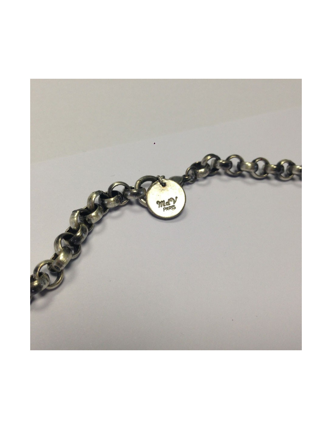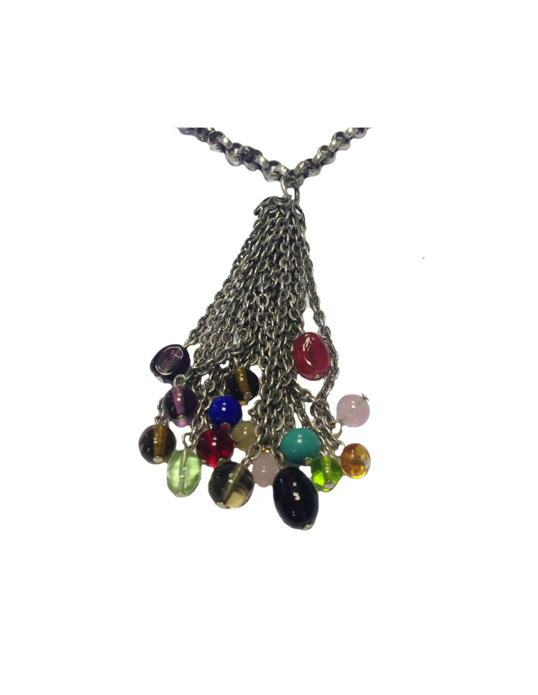 Très beau sautoir Marguerite de Valois avec pendentif pampille en petite chaîne argentée, ornée de petites perles en pâte de verre multicolore. Jamais porté.