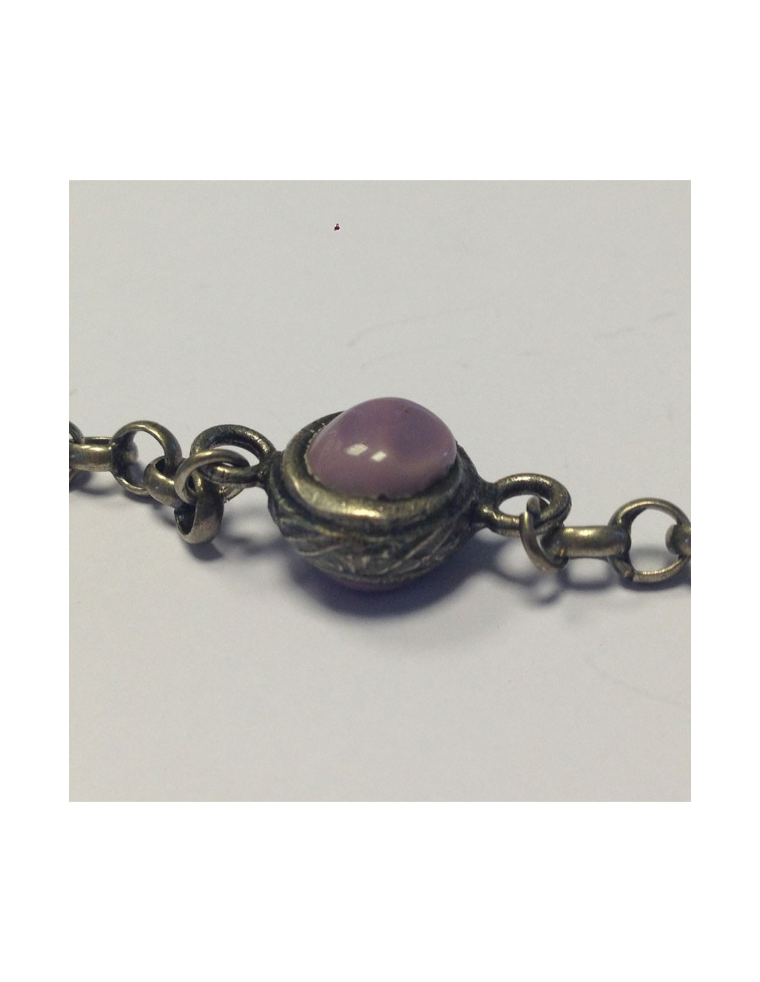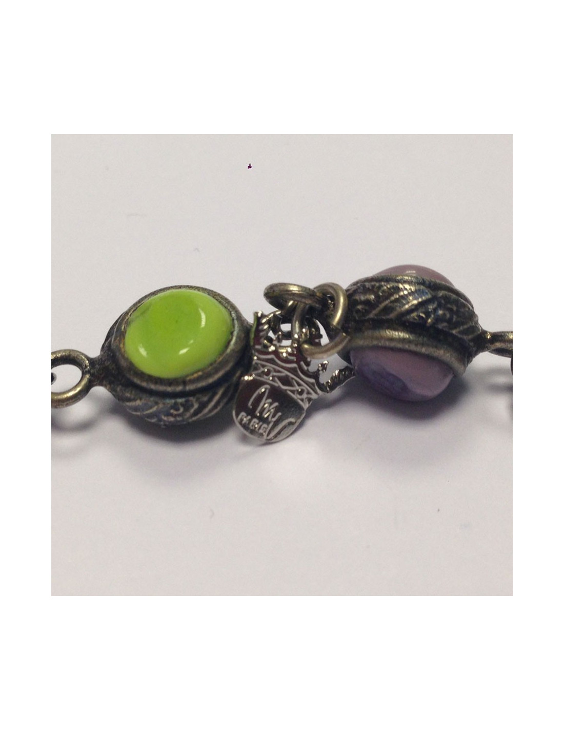 chaîne en argent vieilli serti de cabochons vert et mauve.