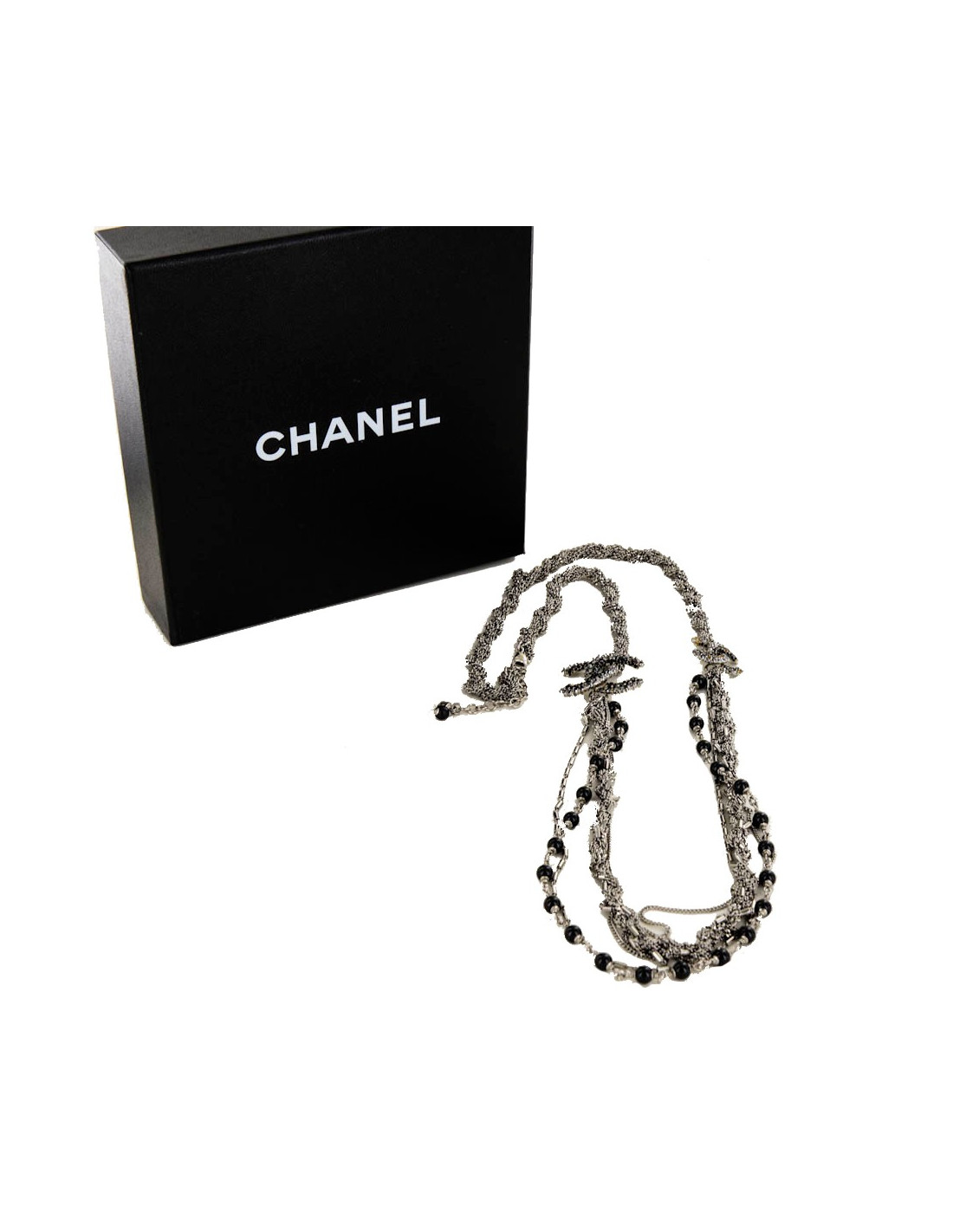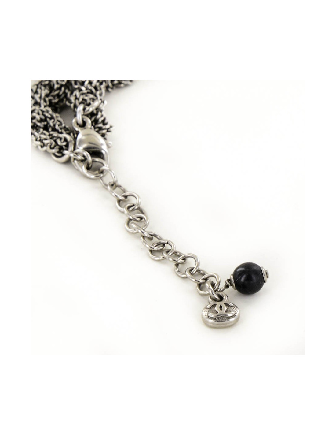 Sautoir CHANEL argent vieilli et strass et perles noires