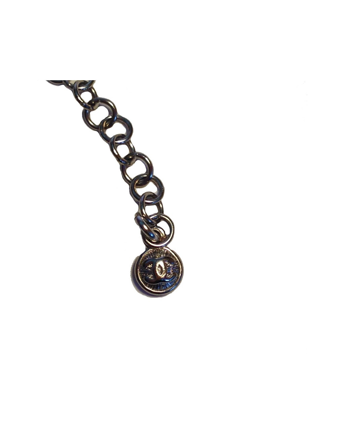 La chaîne en métal argenté est agrémentée de 7 perles nacrées et d'un C C serti de strass.