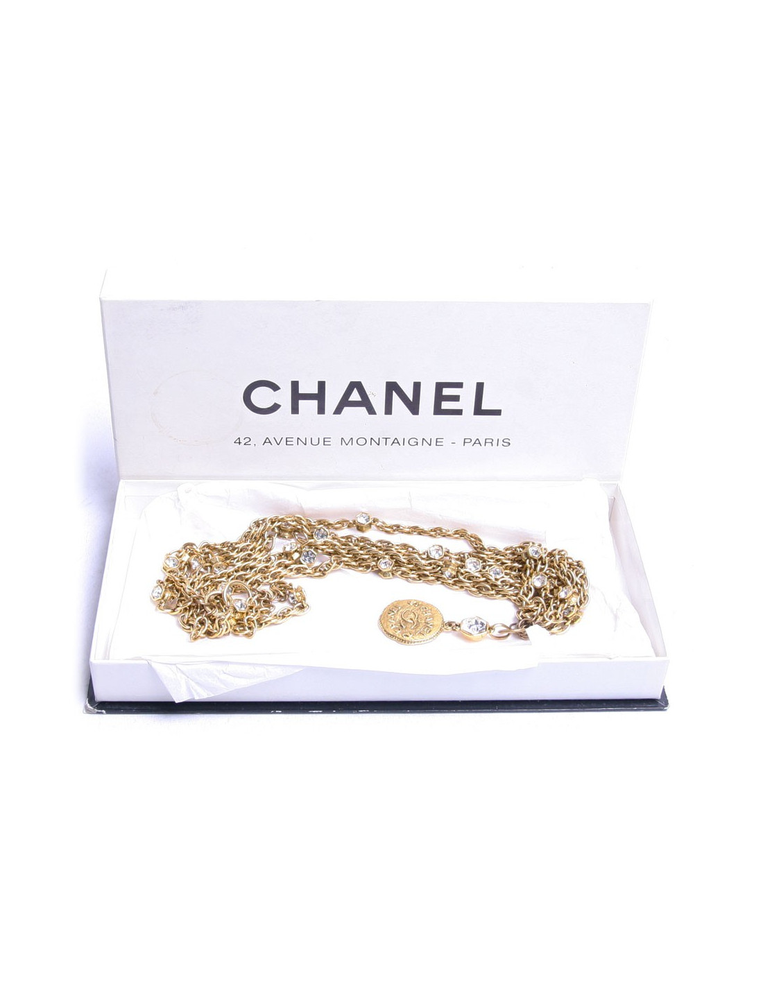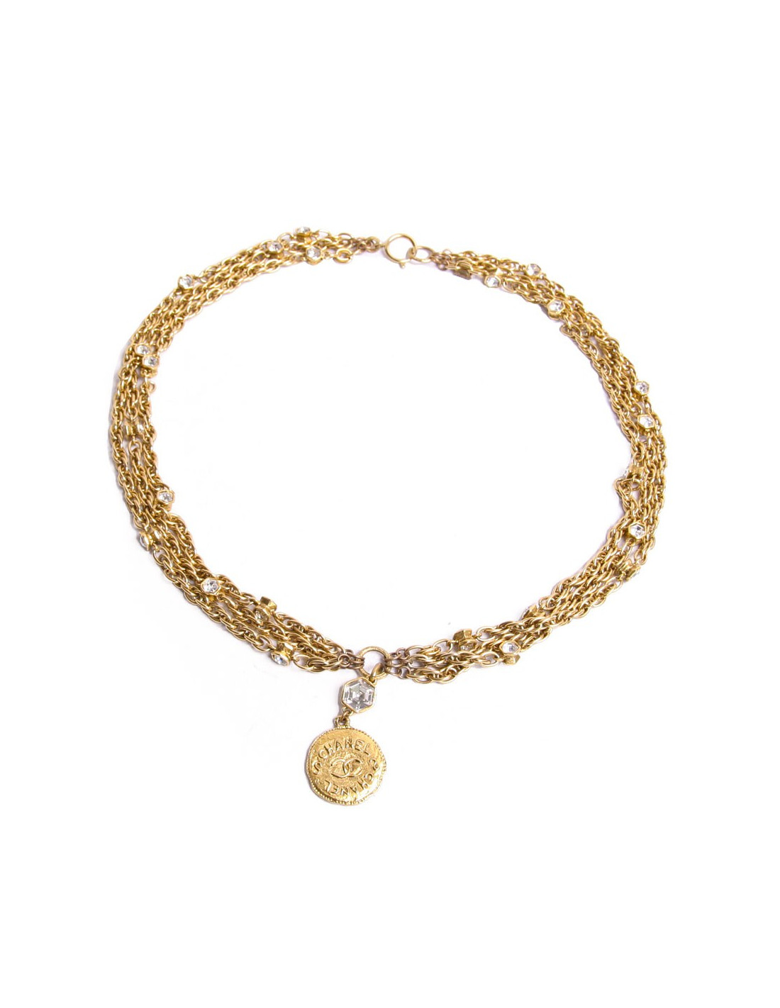 Superbe collier couture de la Maison Chanel, triple rangs en laiton doré, entrecoupés de brillants octogonaux, se terminant par un logo représentant une pièce ancienne martelée siglée Chanel , le collier se ferme par un mousqueton, pièce vintage; bon état : infimes détails la dorure est légèrement passée sur les derniers anneaux.