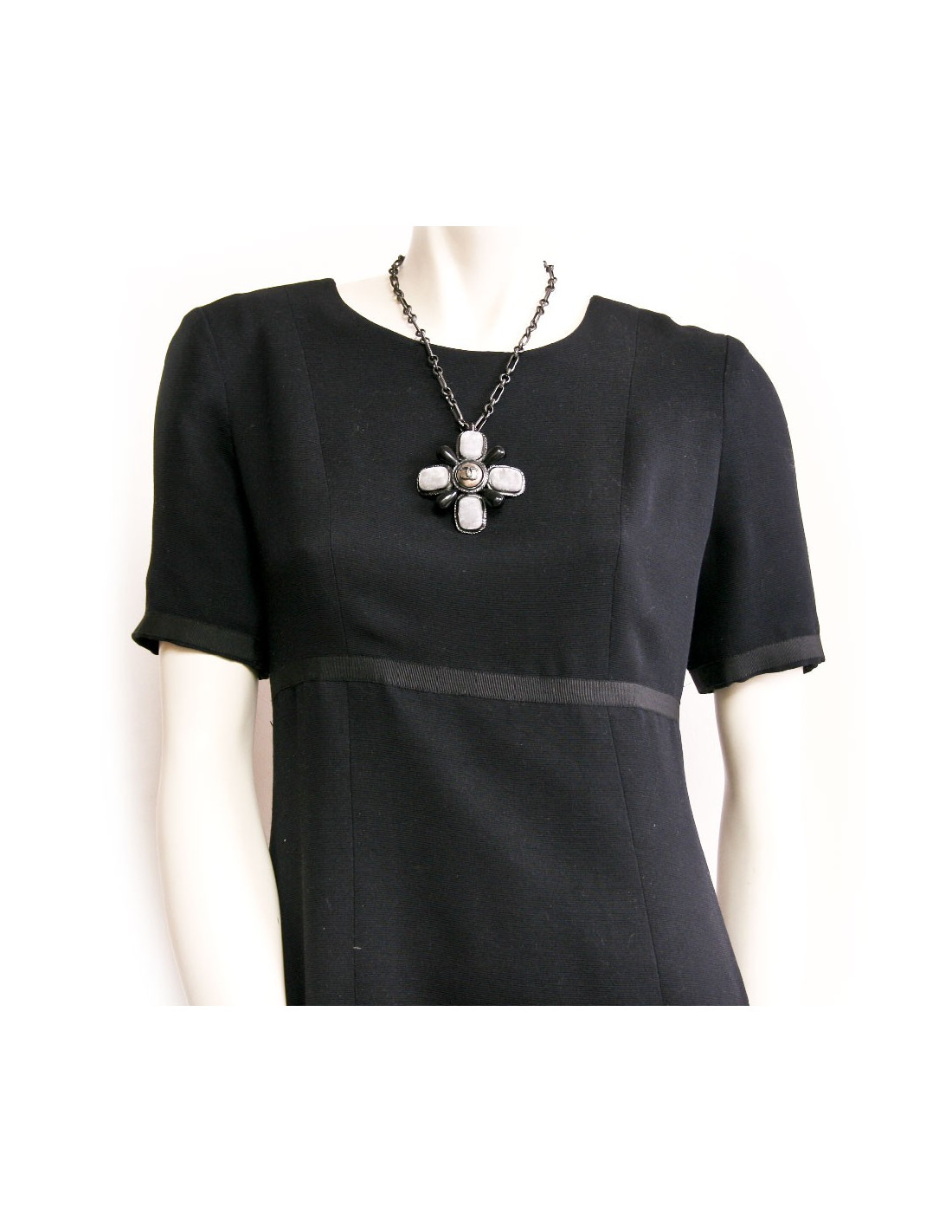 Ravissant collier croix Chanel, en métal argent vieilli (ruthénium). Il est serti de perles ovales en pâte de verre et recouvert sur 4 perles cabochons en panne de velours gris.