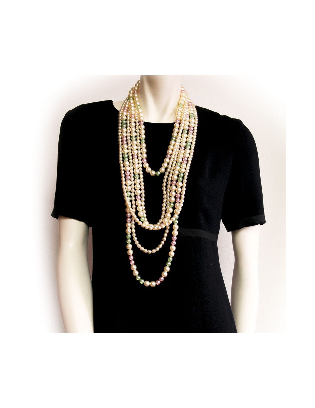 Important sautoir 6 rangs multicolore, Chanel. le plus long rang mesure 106 cm. Il est en très bon état. Il faudrait prévoir un renfilage. les perles sont nacrées, vert, rose.