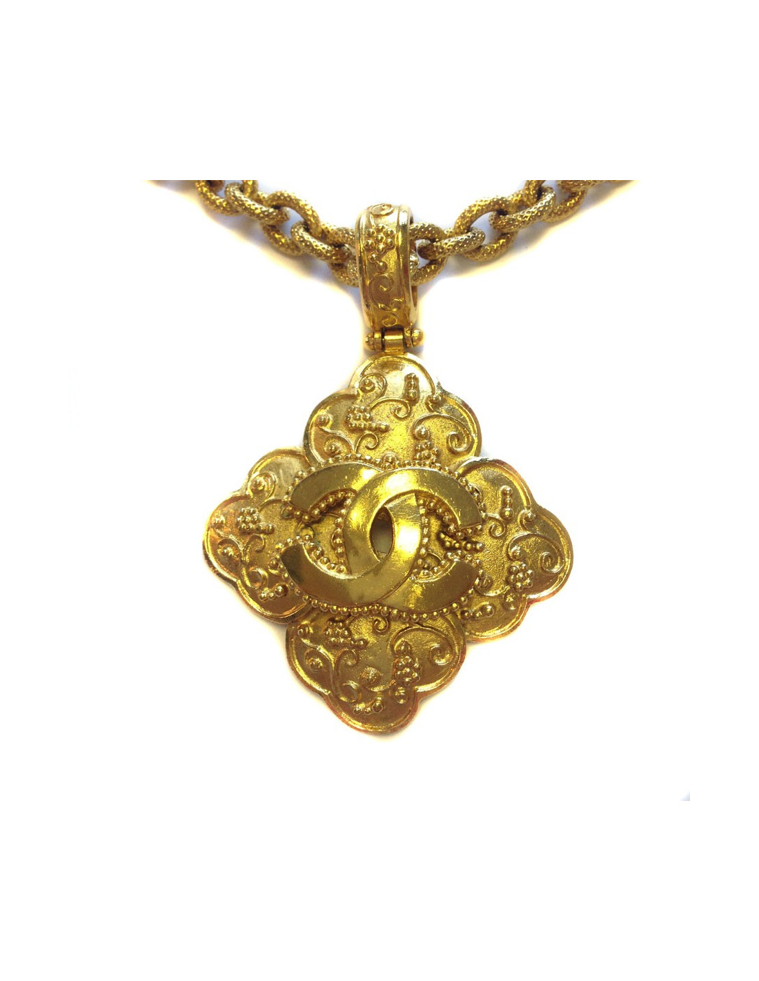 Magnifique sautoir CHANEL vintage de l'année 1995. Le collier est en métal doré composé d'une longue chaîne en maille martelée et d'un pendentif surmonté d'un large CC. Fermoir en forme de crochet. En très bon état.