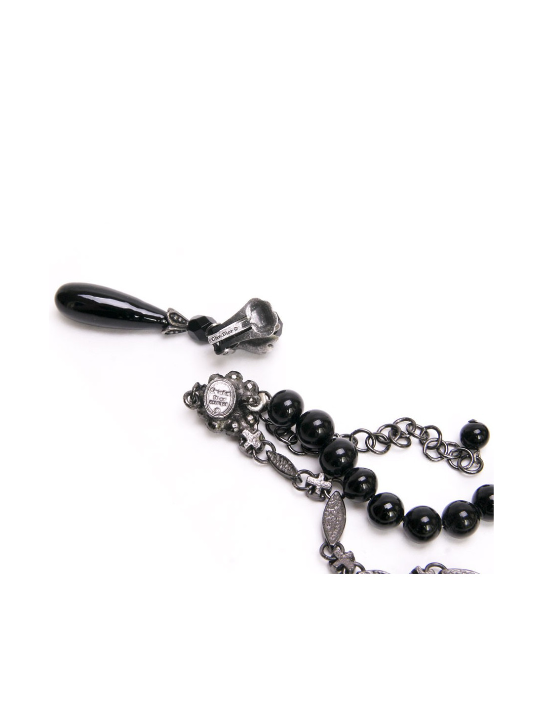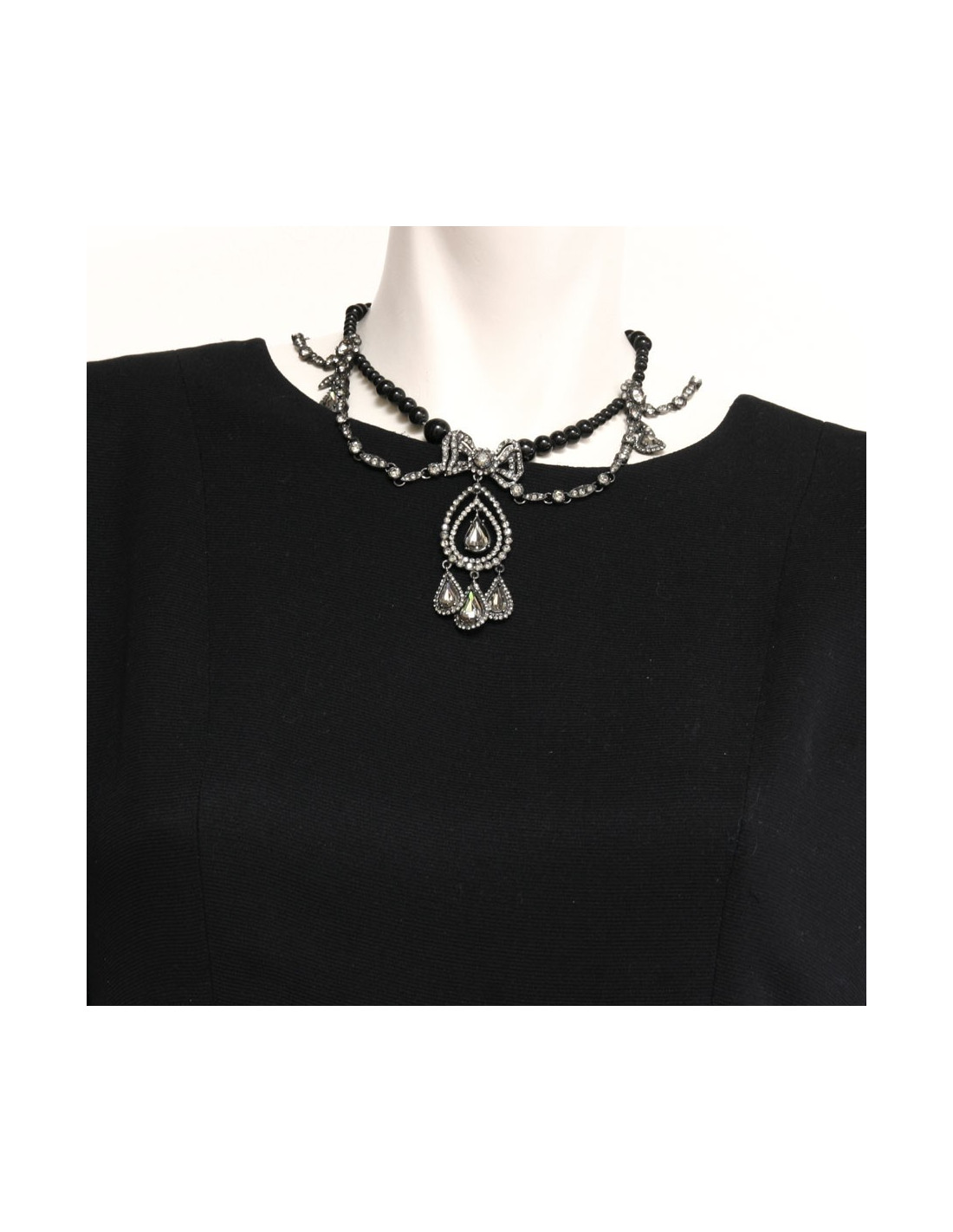 Ravissant collier Christian Dior, style Empire, perles noires en chute, noeud en strass gris et strass (gris) taillées en poire. Les clips d'oreille sont en perles noires facettées et perles lisses noires en poire.