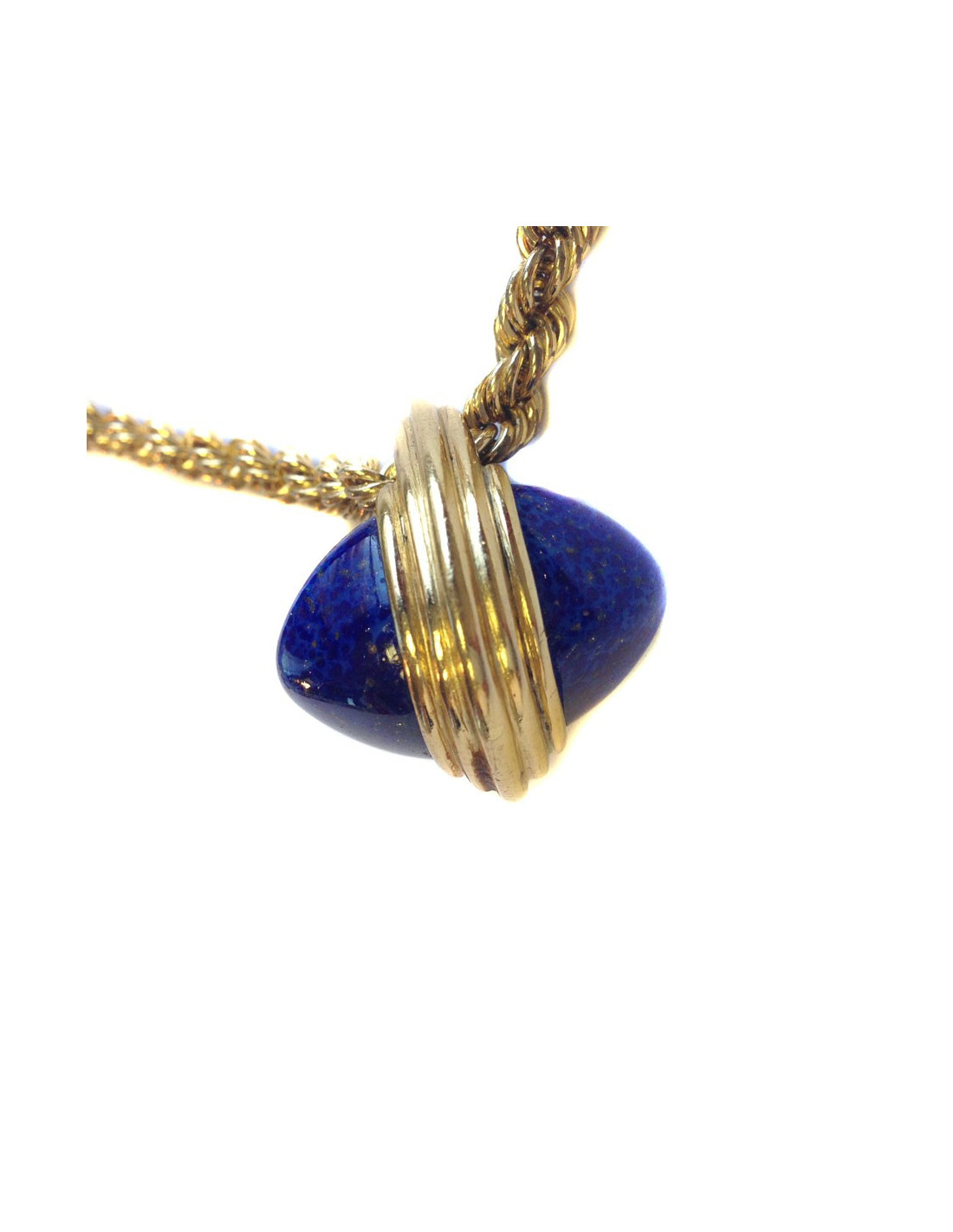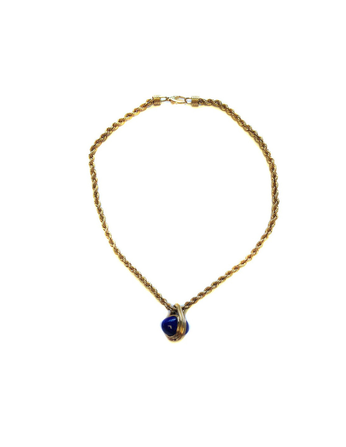 Très beau collier fantaisie avec chaîne corde torsadée en métal doré et pendentif façon lapis lazuli. En très bon état général.
