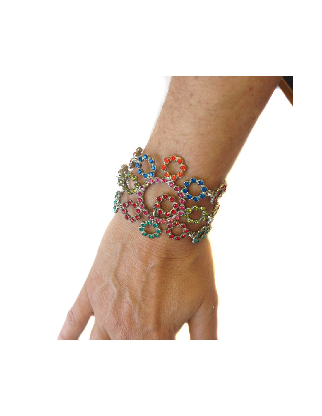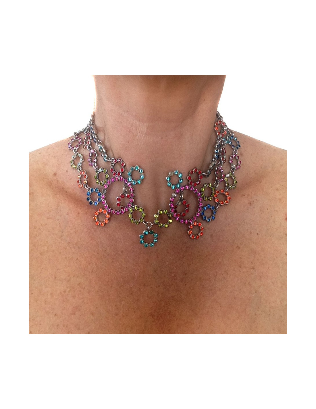 Collector ! Parure collier et bracelet Jean Paul Gaultier, anneaux et fleurs en cristaux de Swarovski multicolores (orange, vert, bleus, rose et rubis). Il manque quelques cristaux dans la parure. En métal argenté. Fermoir crochet. En bon état général.
