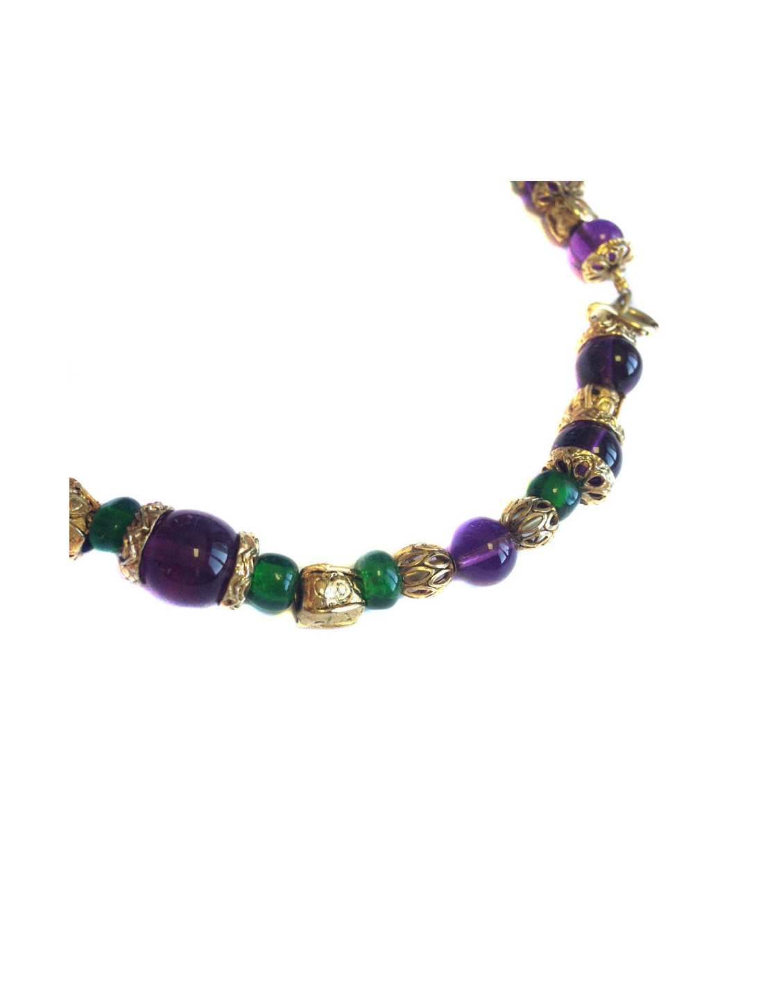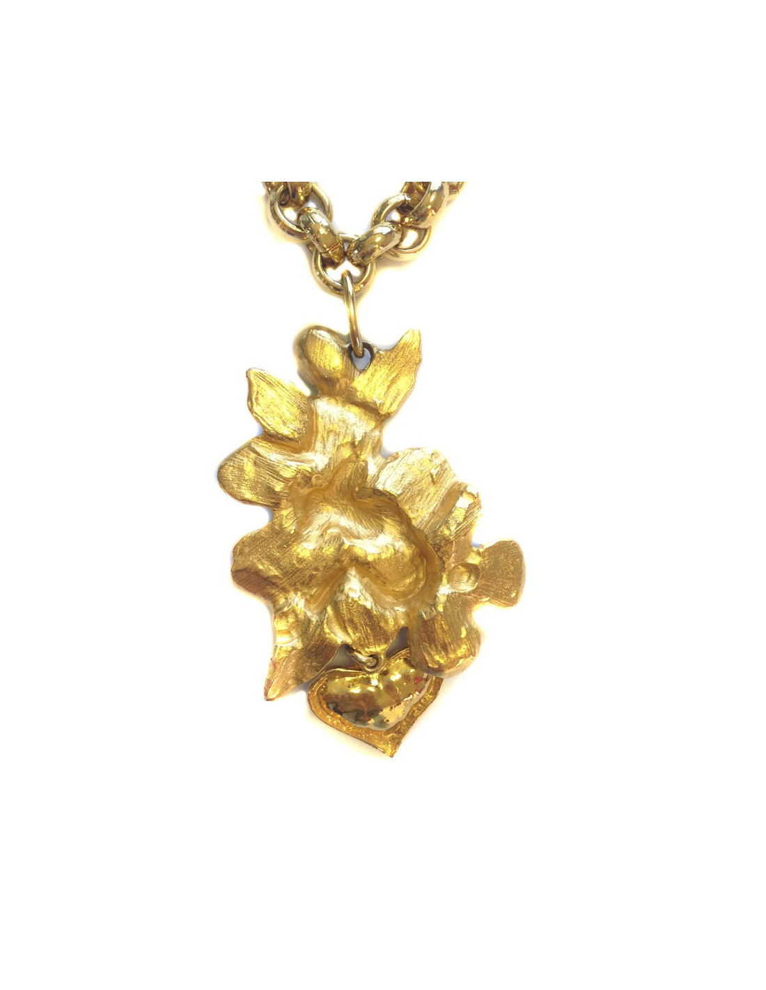 Superbe collier haute couture Fleurs de Christian LACROIX, en résine et pâte de verre. Pierres dans les tons parmes, vert. Pendentif coeur en métal doré. Une partie du collier est en chaîne à anneaux moyens en métal doré. Collier en très bon état.