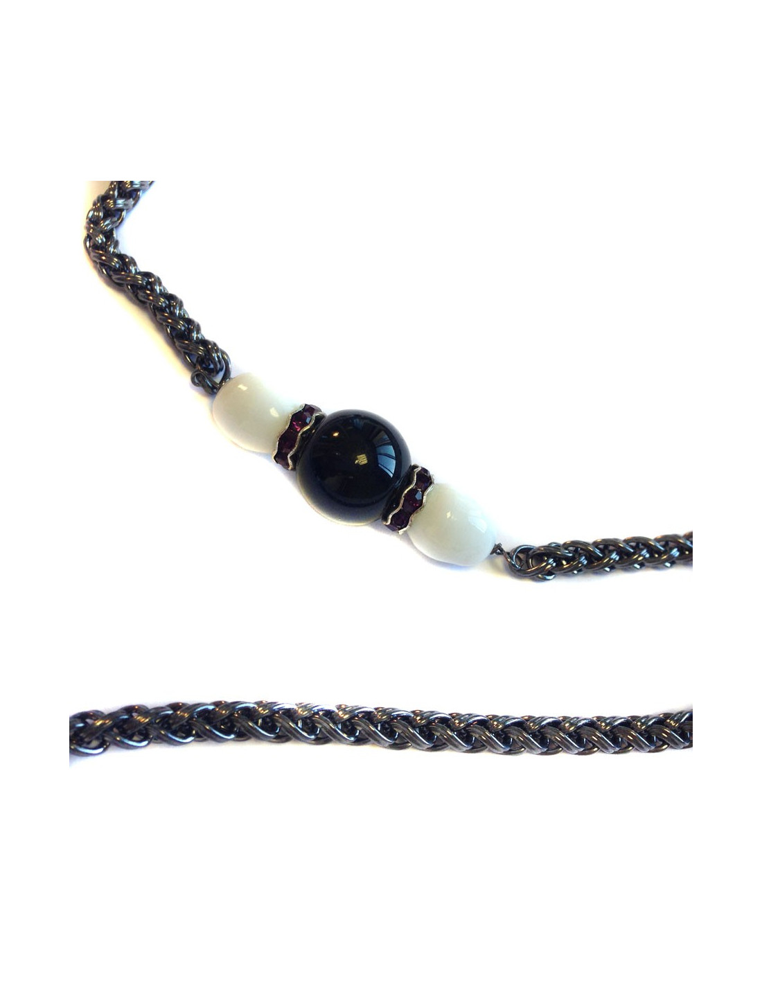 Magnifique sautoir très couture Marguerite de Valois en chaîne ruthénium, maille torsadée, perles et cabochons en pâte de verre noirs et blancs. La perle noire est séparée des perles blanches par des strass de swarovski violets. Réalisé au sein des Ateliers Marguerite de Valois en France, fait à la main par des artisans bijoutiers.
