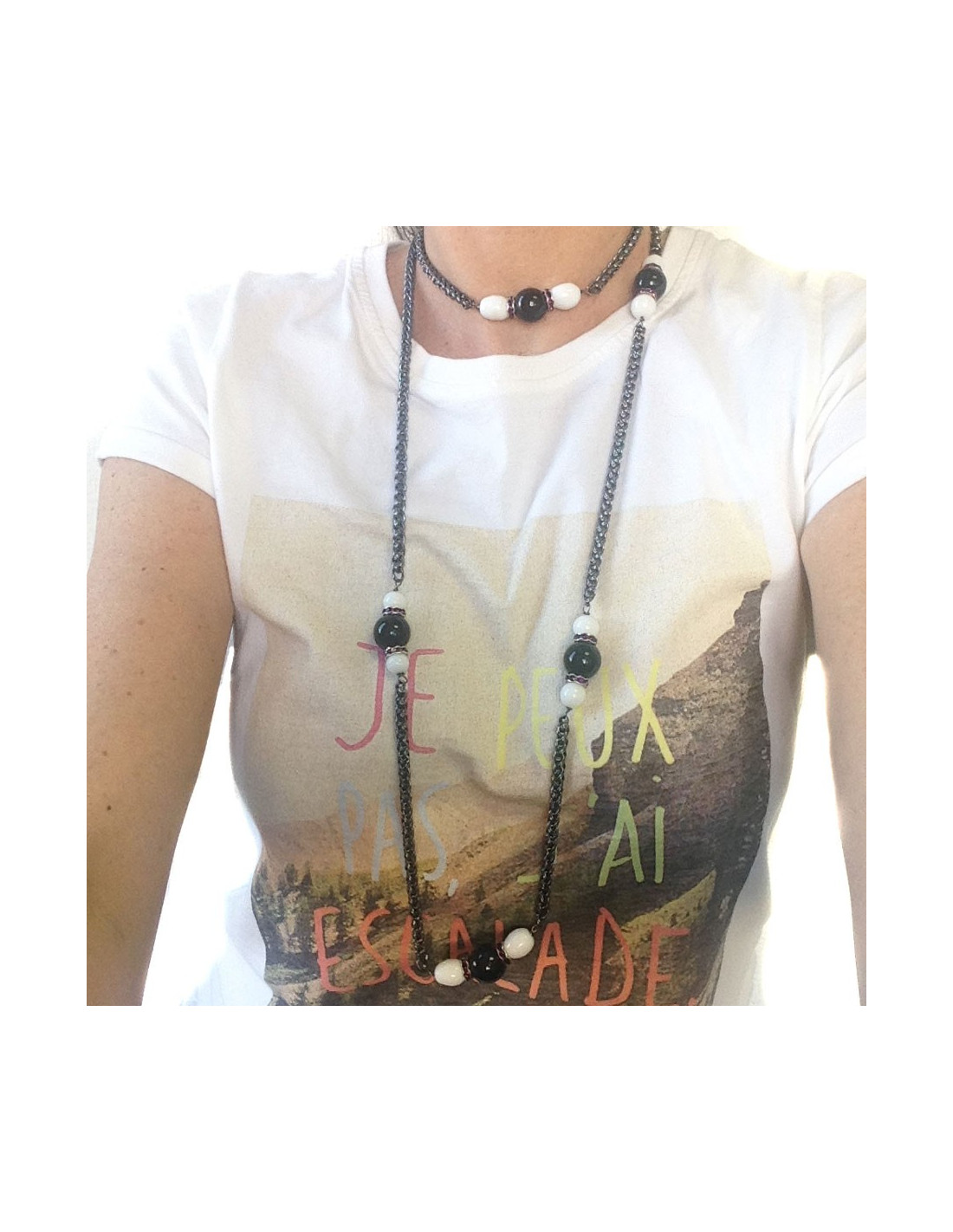 chaîne 64 cm - perles blanches: 1 cm de diamètre - perles noires: 1,5 cm de diamètre cabochons: 1,3 cm