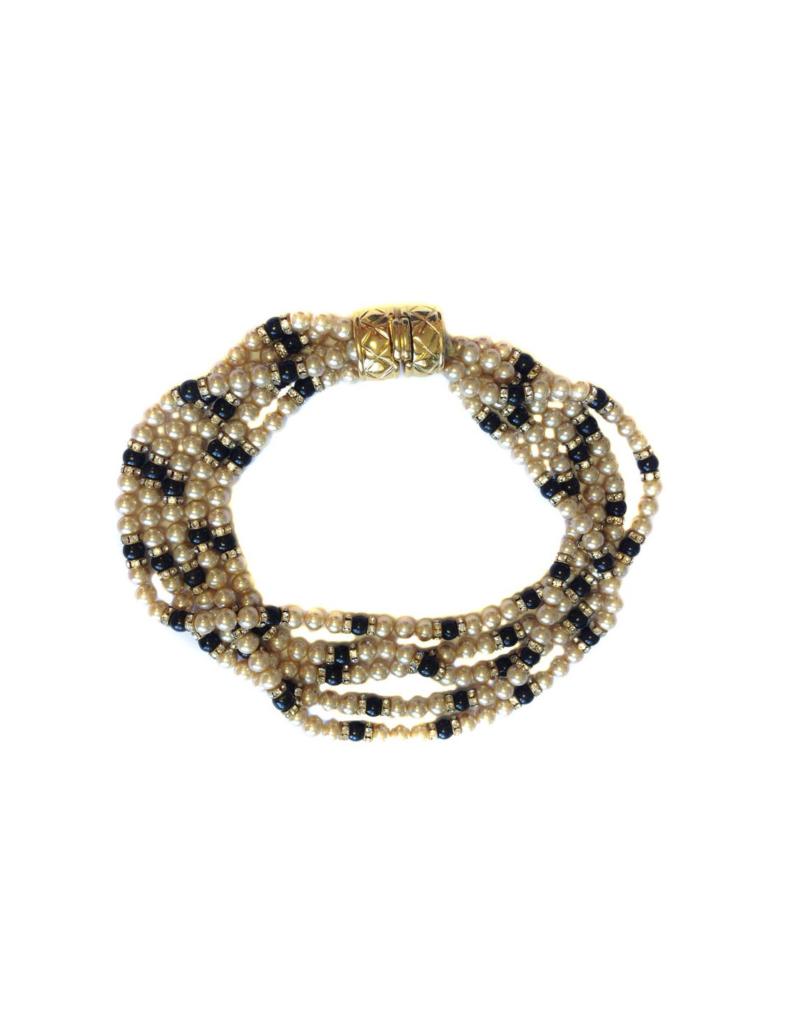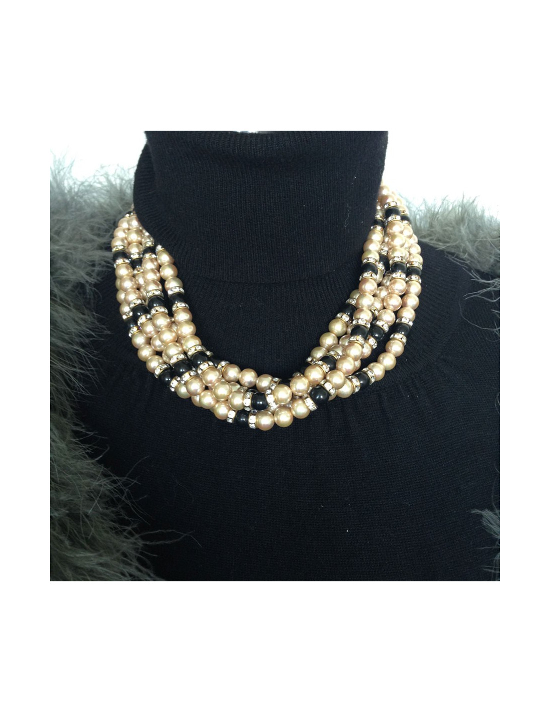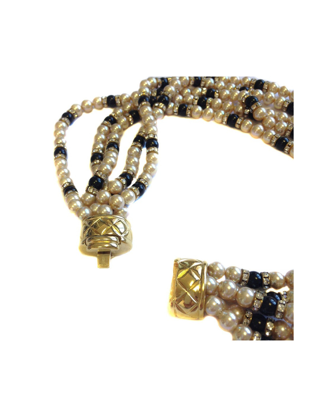 Très beau collier ras du cou de la maison VOGUE BIJOUX, mutli-rangs de perles nacrées et noires, serti également de strass swarovski blancs. Fermoir à cliquet en métal doré, effet matelassé.