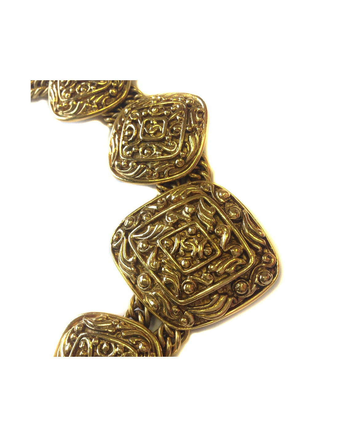 Magnifique collier couture de la maison CHANEL. Ras du cou vintage à 2 chaînes maillées, composé de 5 pièces en métal dorés. pièces en forme de diamants avec des décorations florales et un CC au centre. Fermoir à crochet. Collier en très bon état.