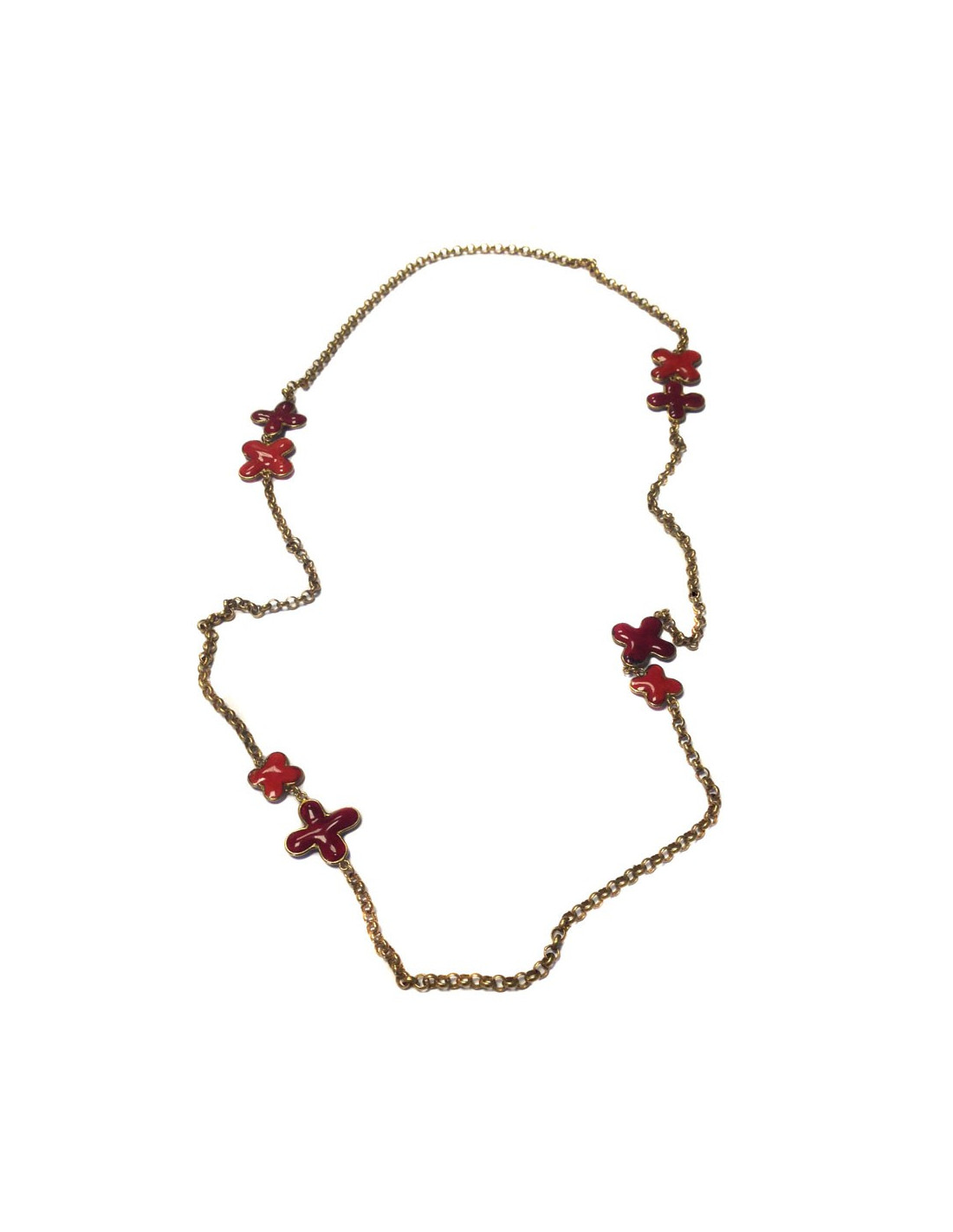 Sautoir Marguerite de Valois, chaine en métal doré vieilli et pâte de verre rouge sang et corail en forme de trèfle. Jamais porté.