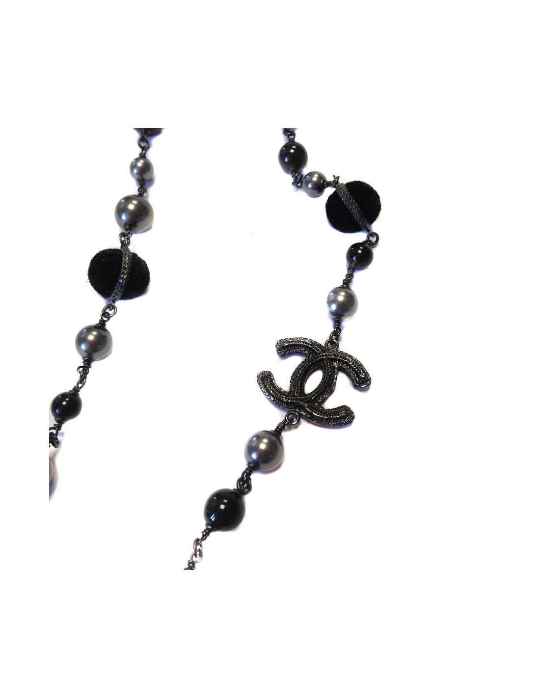 Superbe sautoir Chanel, en perles, velours noir, pâte de verre couleur acier, noire et chaîne ruthénium. Un CC en ruthénium agrémente la chaîne.Peut se porter en sautoir ou en double chaîne. Jamais porté.