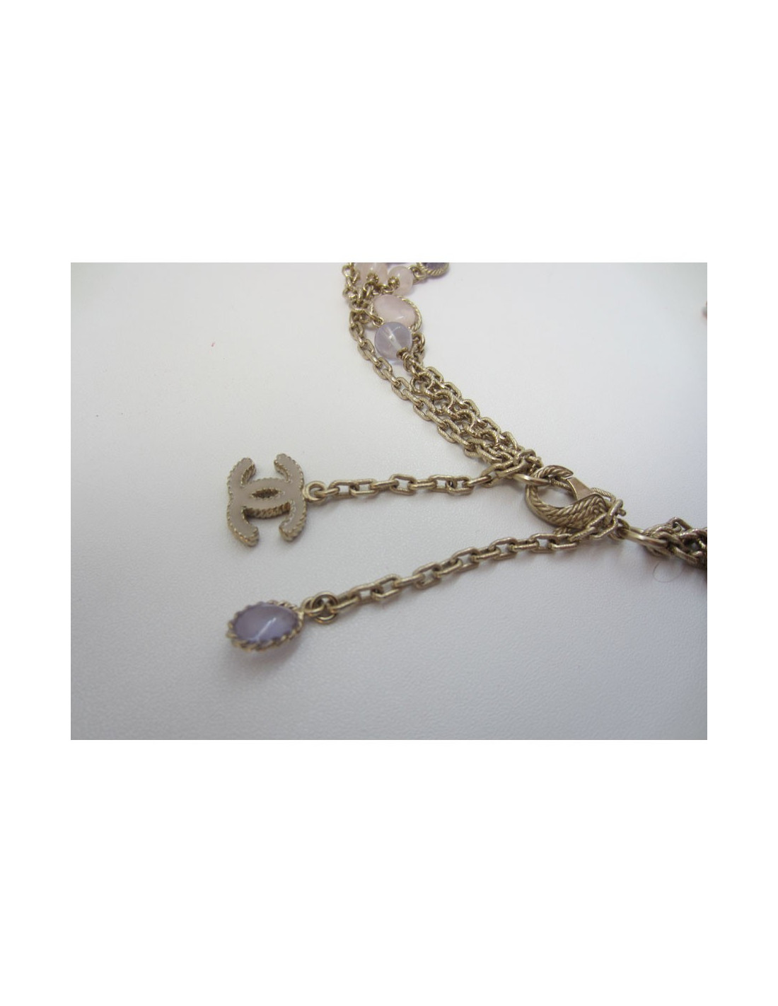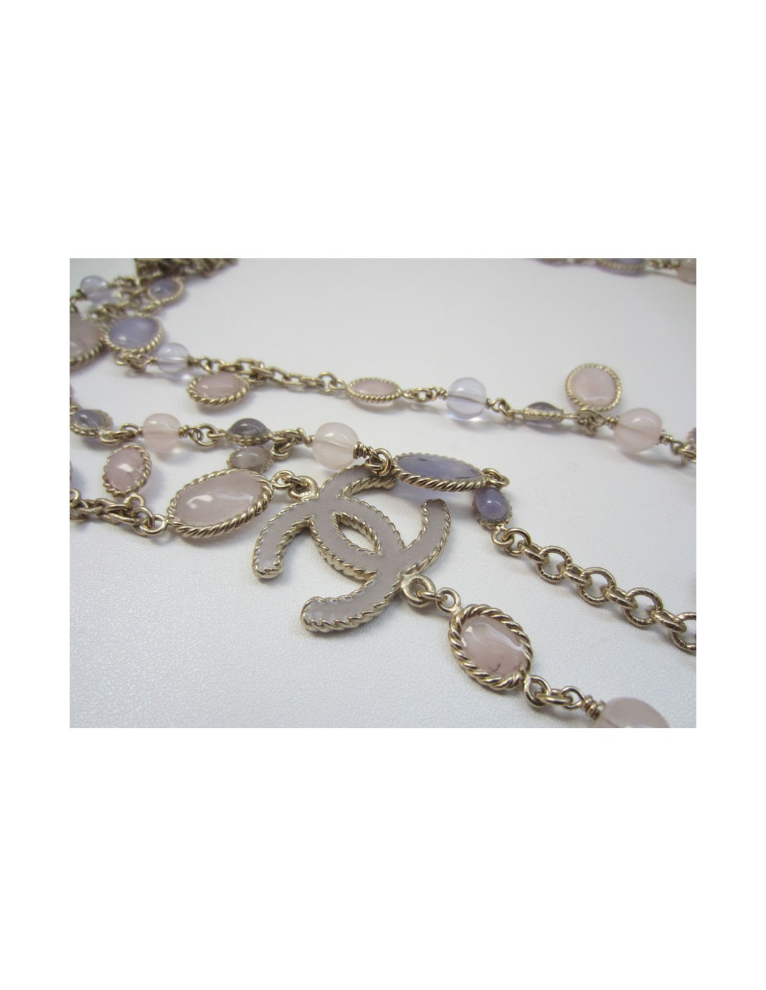 Sublime sautoir Chanel triple rangs Couture en pâte de verre rose pâle, bleu ciel, monté sur une chaine or pâle. PIÈCE EXCEPTIONNELLE dans un état impeccable, comme neuf.