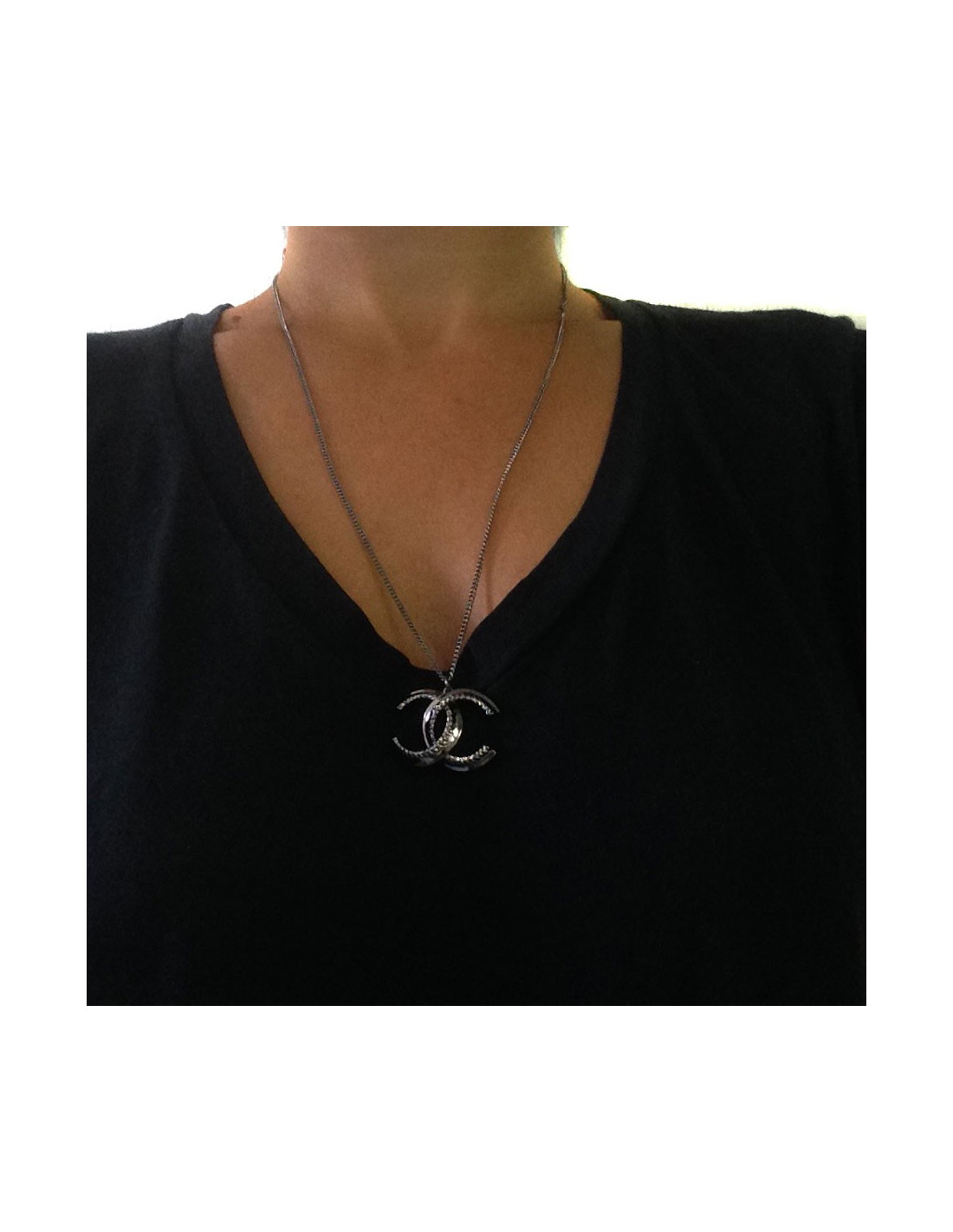 Joli collier CC Chanel, en métal argent noirci (ruthénium). Il se porte court ou long. État neuf.