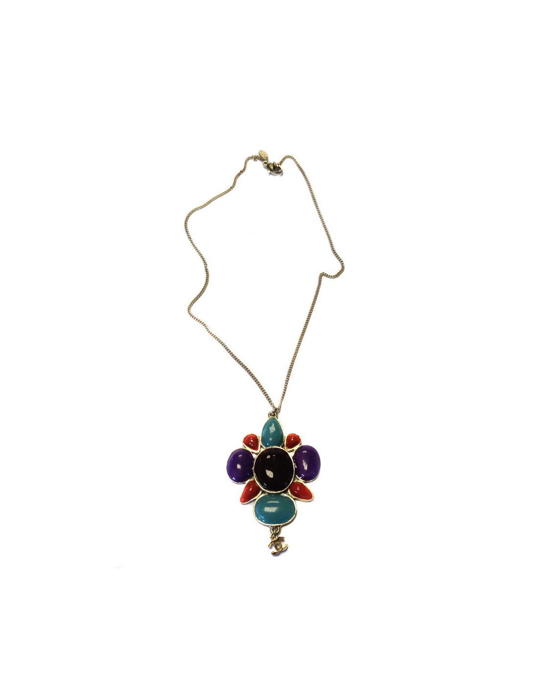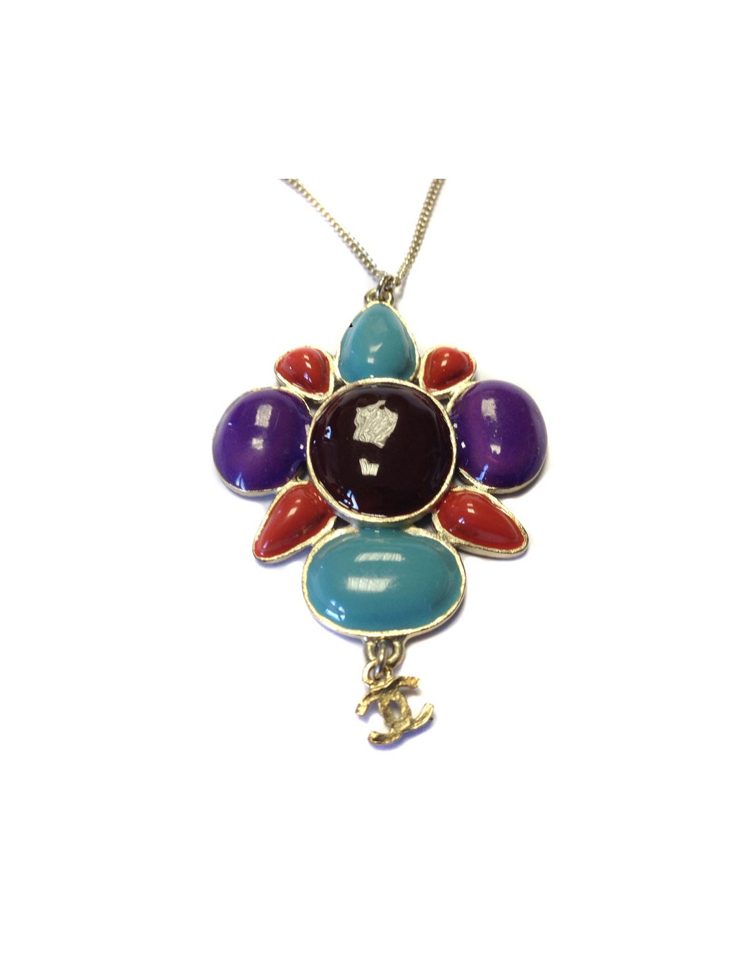 Il est composé d'un pendentif émaillé bleu,corail, violet, marron et d'un CC pendant et enfin d'une chaine métal doré pâle Chanel. collection automne 2007