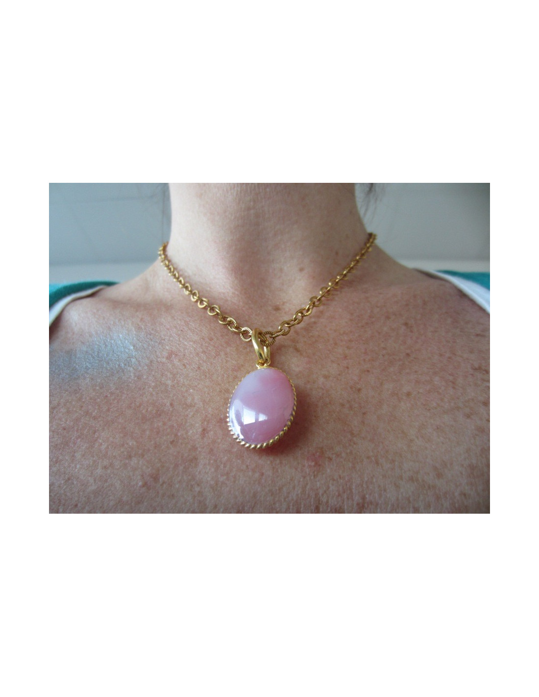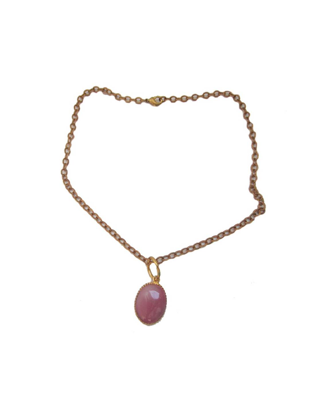Collier pendentif Marguerite de Valois, de forme ovale en métal doré à l'or fin & pâte de verre rose