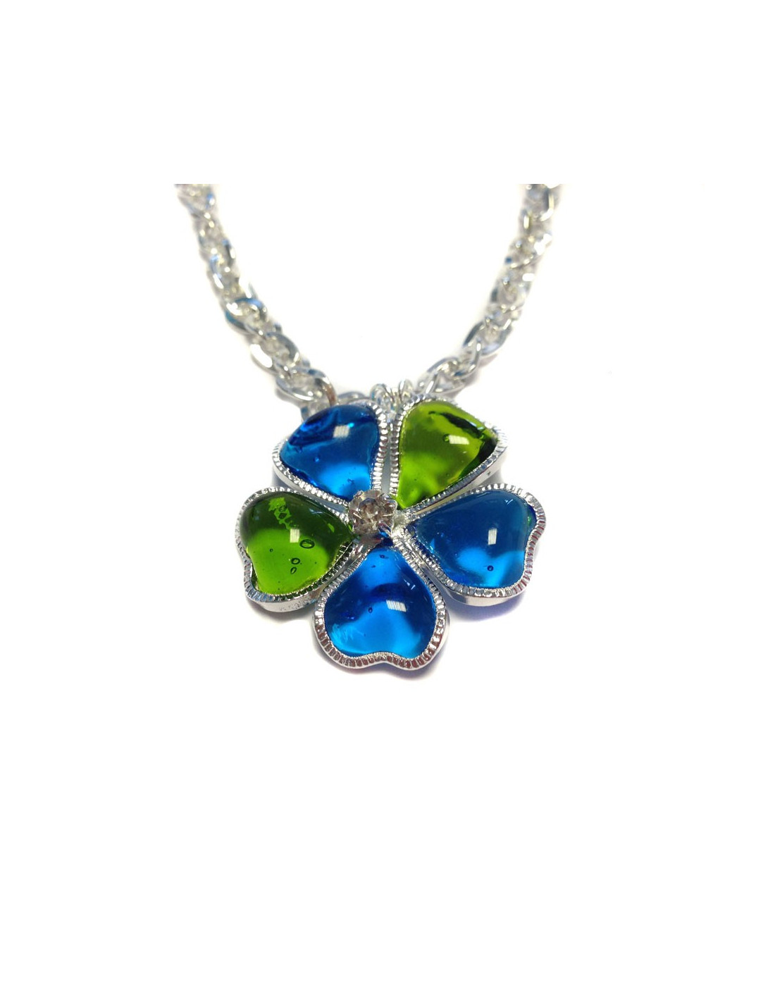 Collier Marguerite de Valois chaîne argentée et pendentif fleurette en pâte de verre vert et bleu clair, petit strass au centre de la fleur. Jamais porté.
