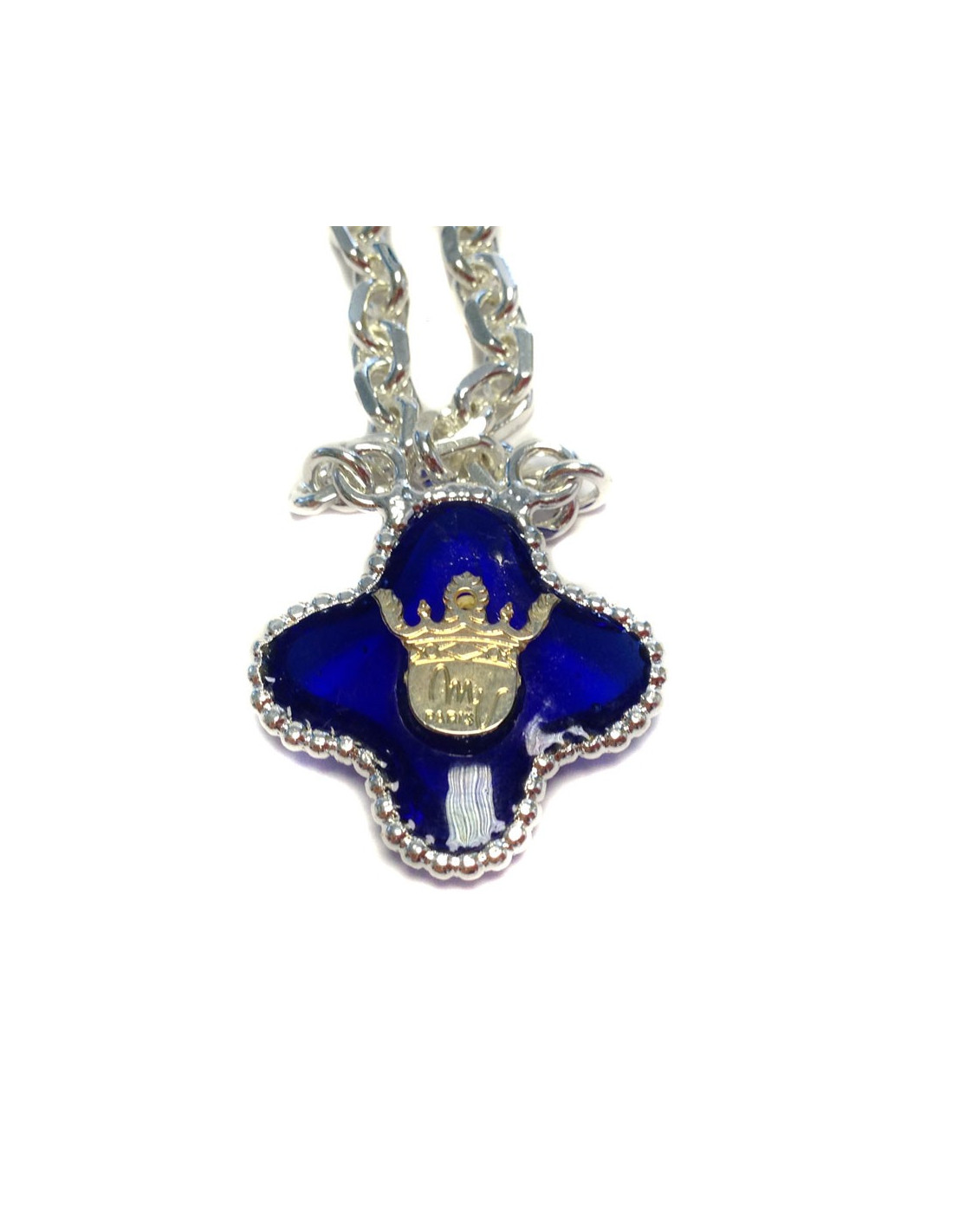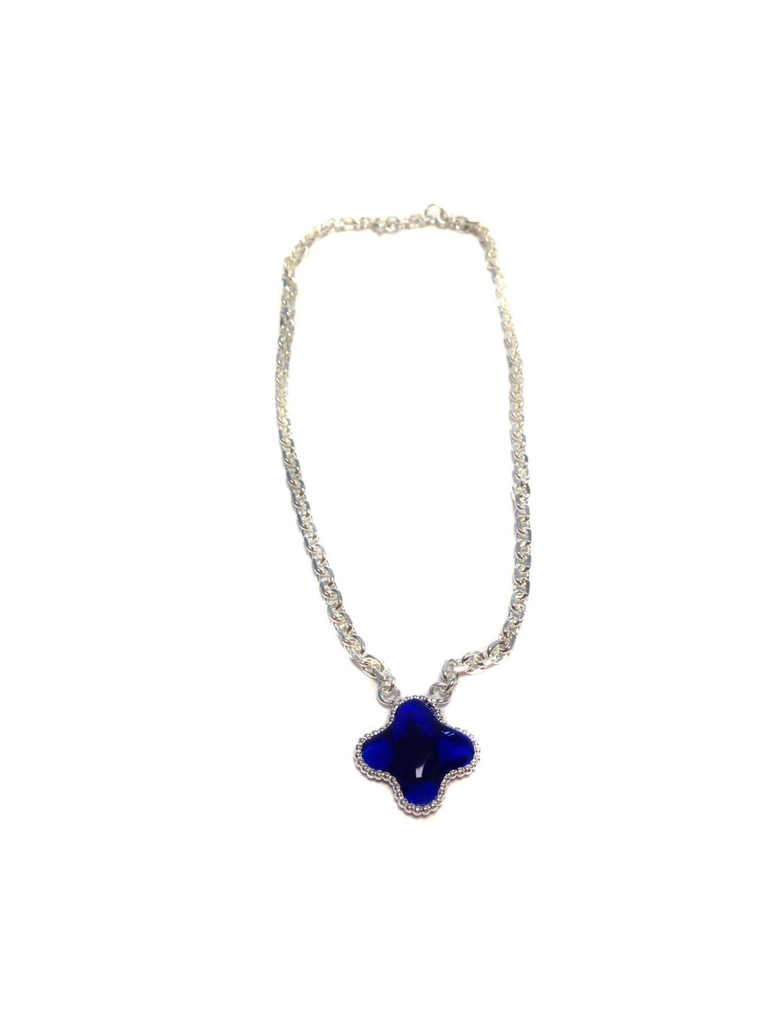 Collier Marguerite de Valois chaîne argentée et pendentif trèfle en pâte de verre saphir foncé. Jamais porté.