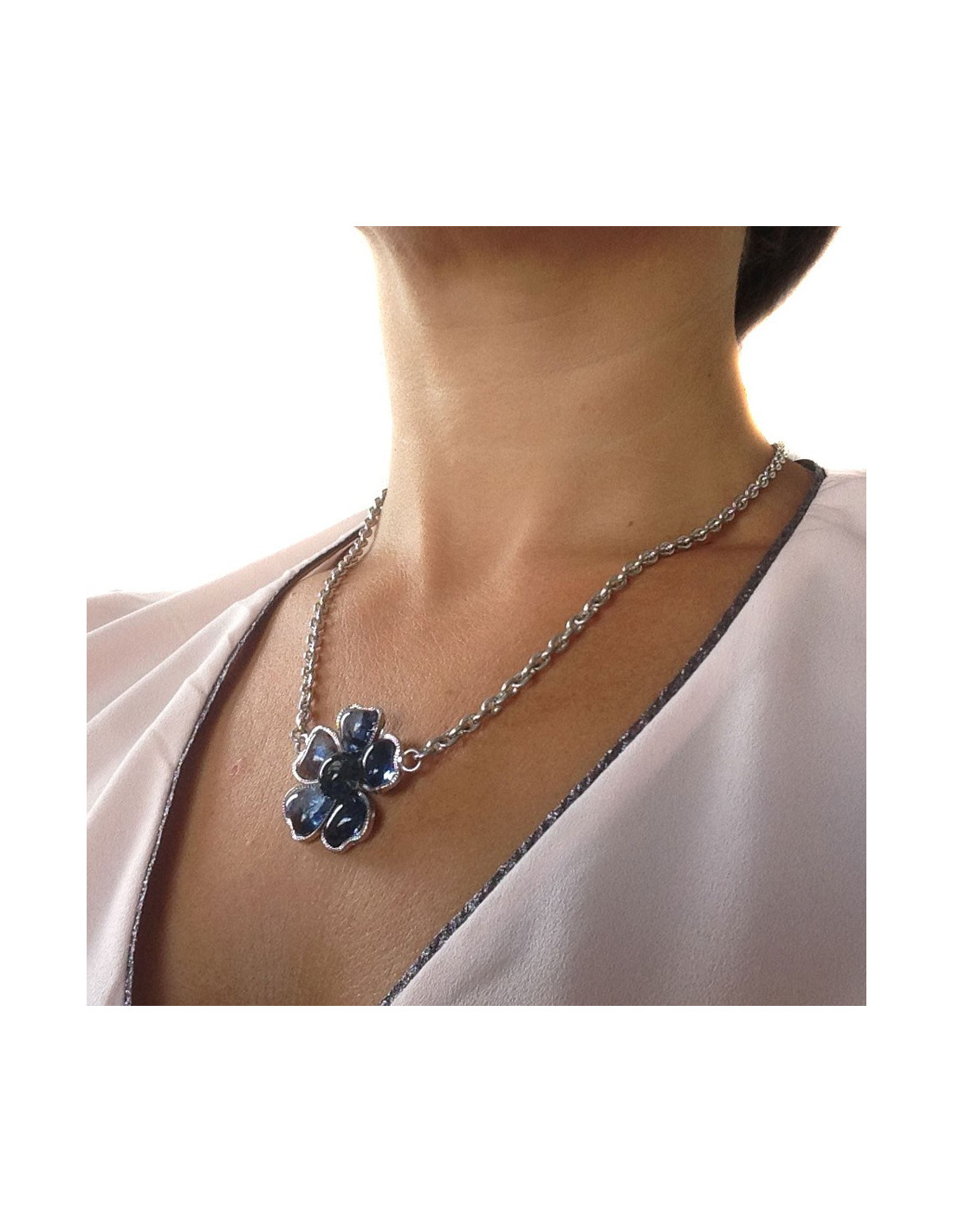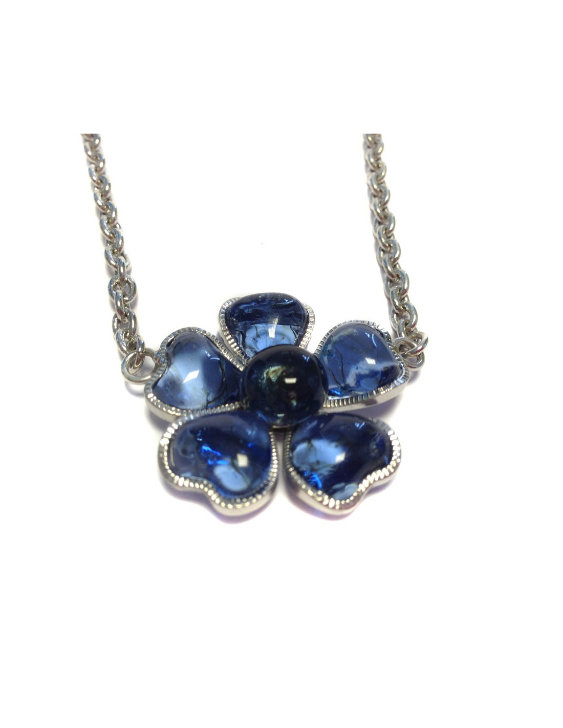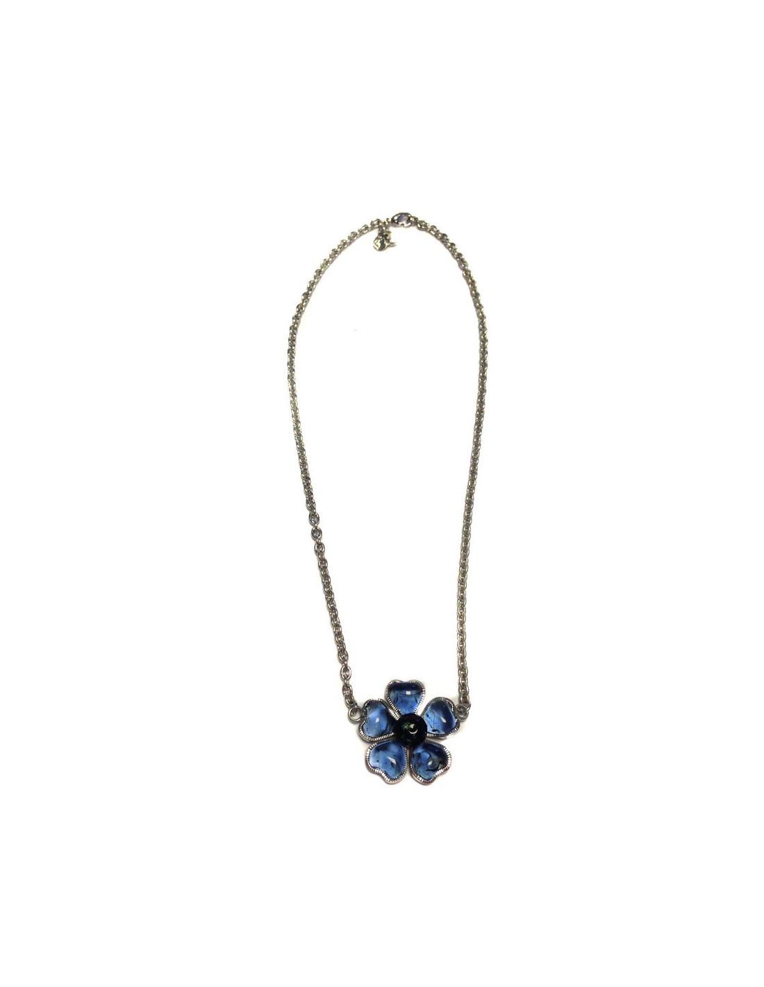 Collier Marguerite de Valois chaîne argentée et pendentif fleurette en pâte de verre saphir foncé. Jamais porté.