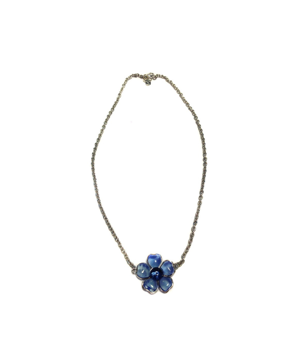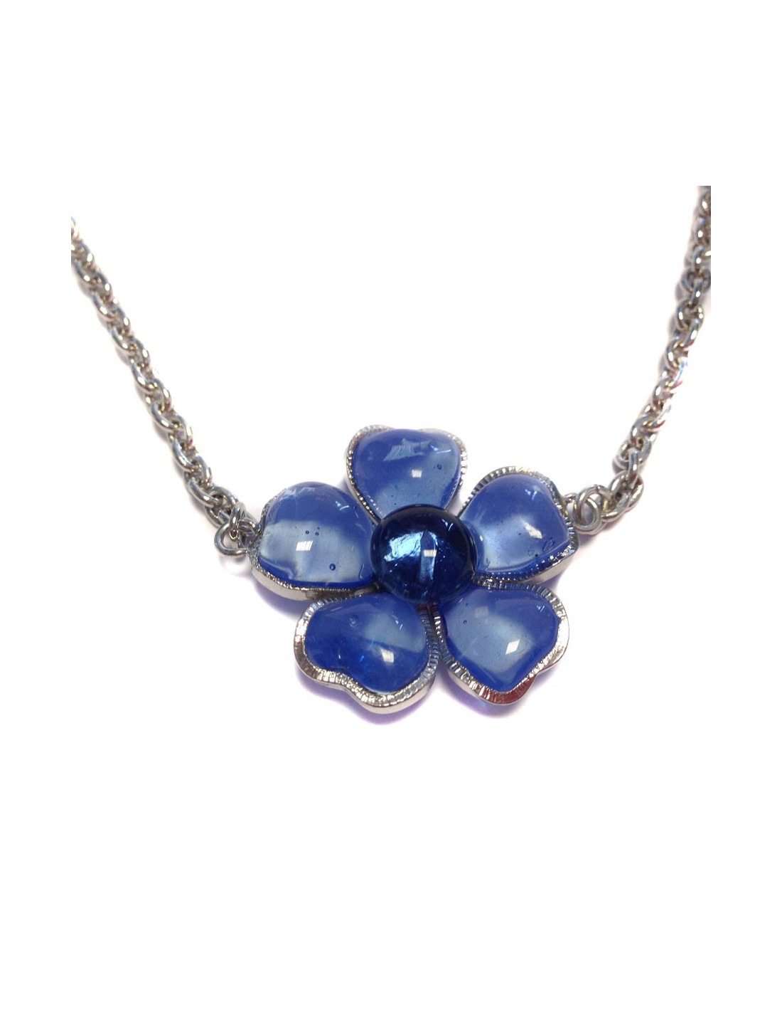 Collier Marguerite de Valois chaîne argentée et pendentif fleurette en pâte de verre saphir clair. Jamais porté.