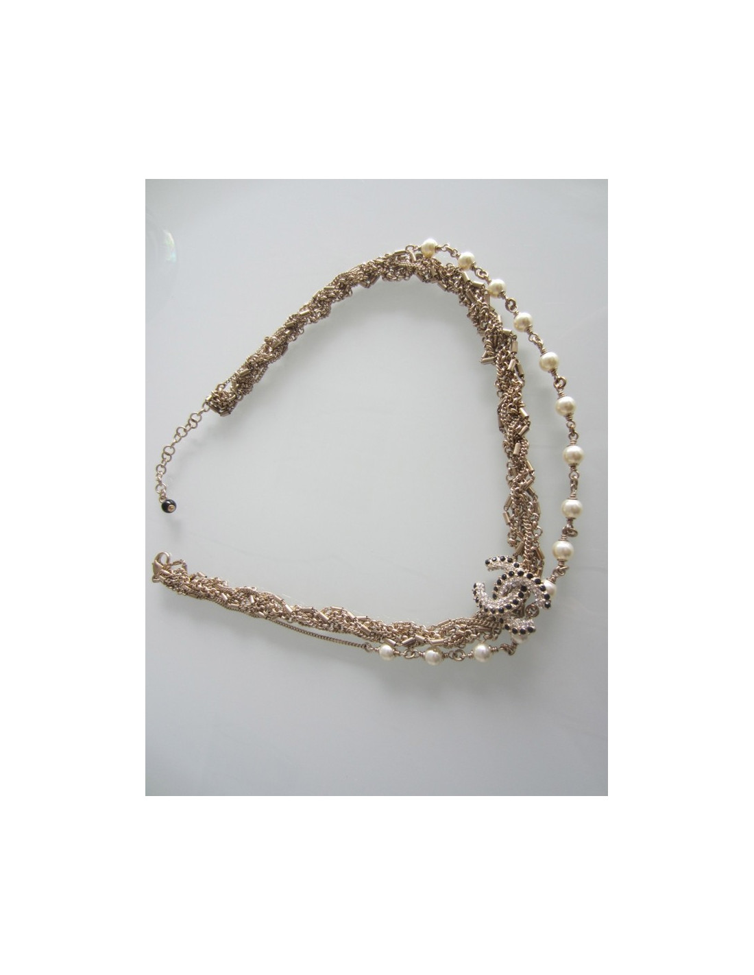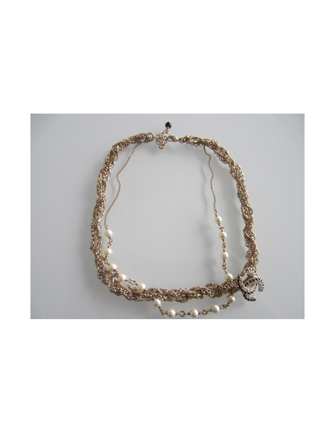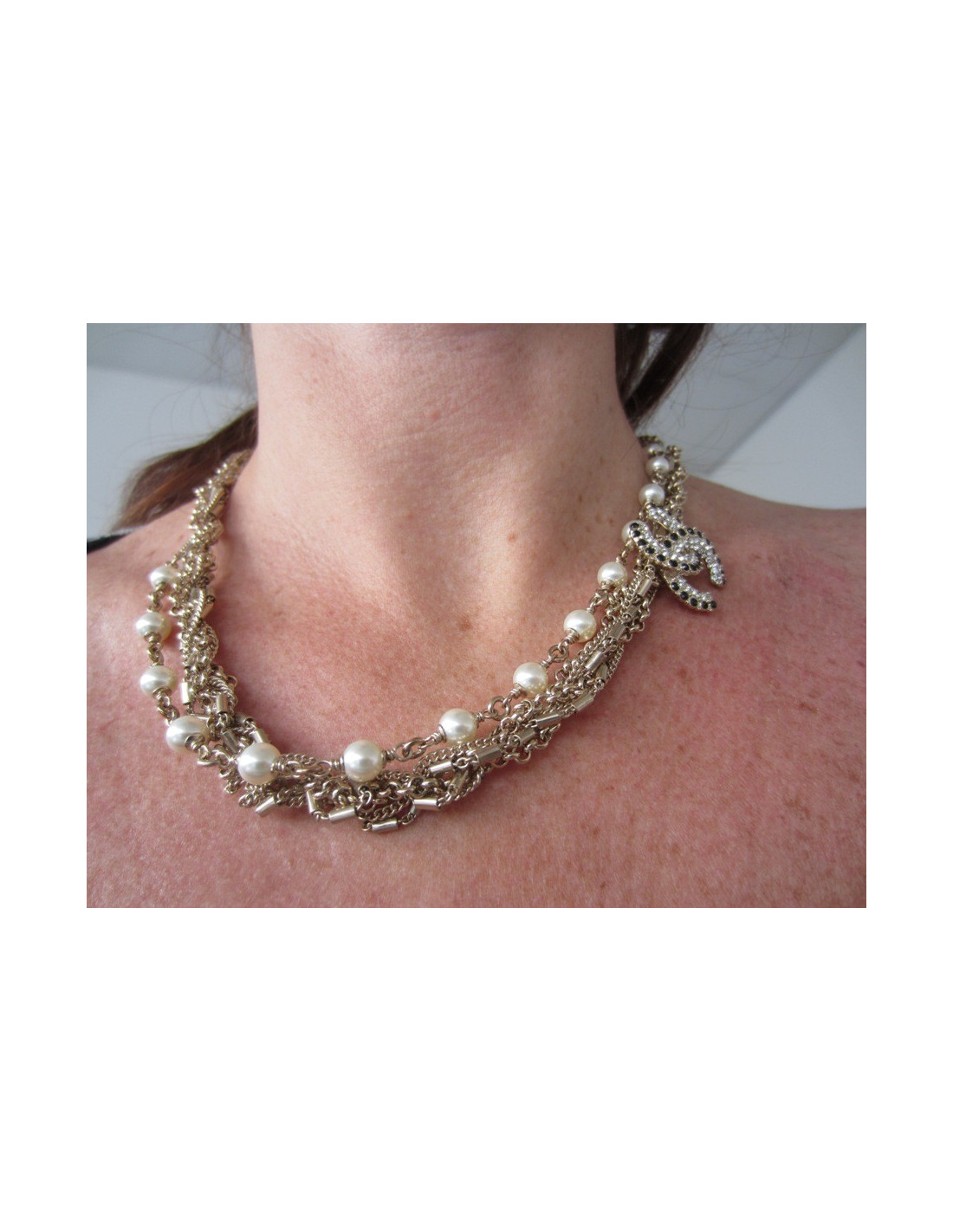 Sublime collier Chanel en métal doré à l'or fin, mélande de 6 chaines Chanel entrelacées surmonté d'un magnifique CC en strass blanc et noir (2 X 2,5cm) + une chaine indépendante composée de perles nacrées.