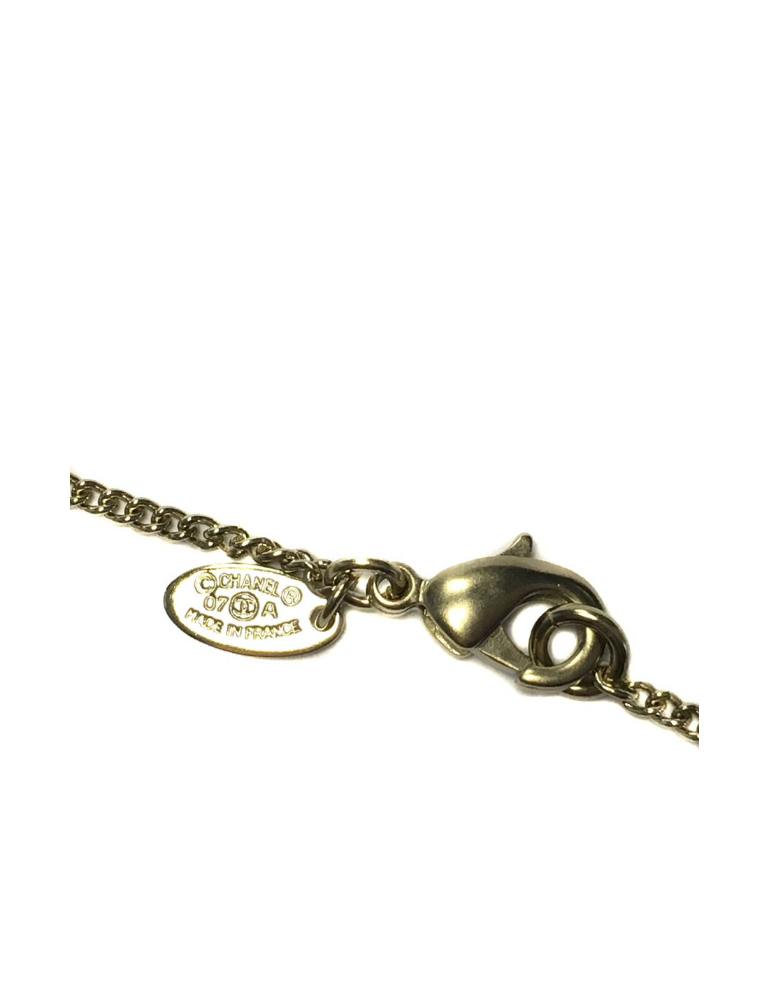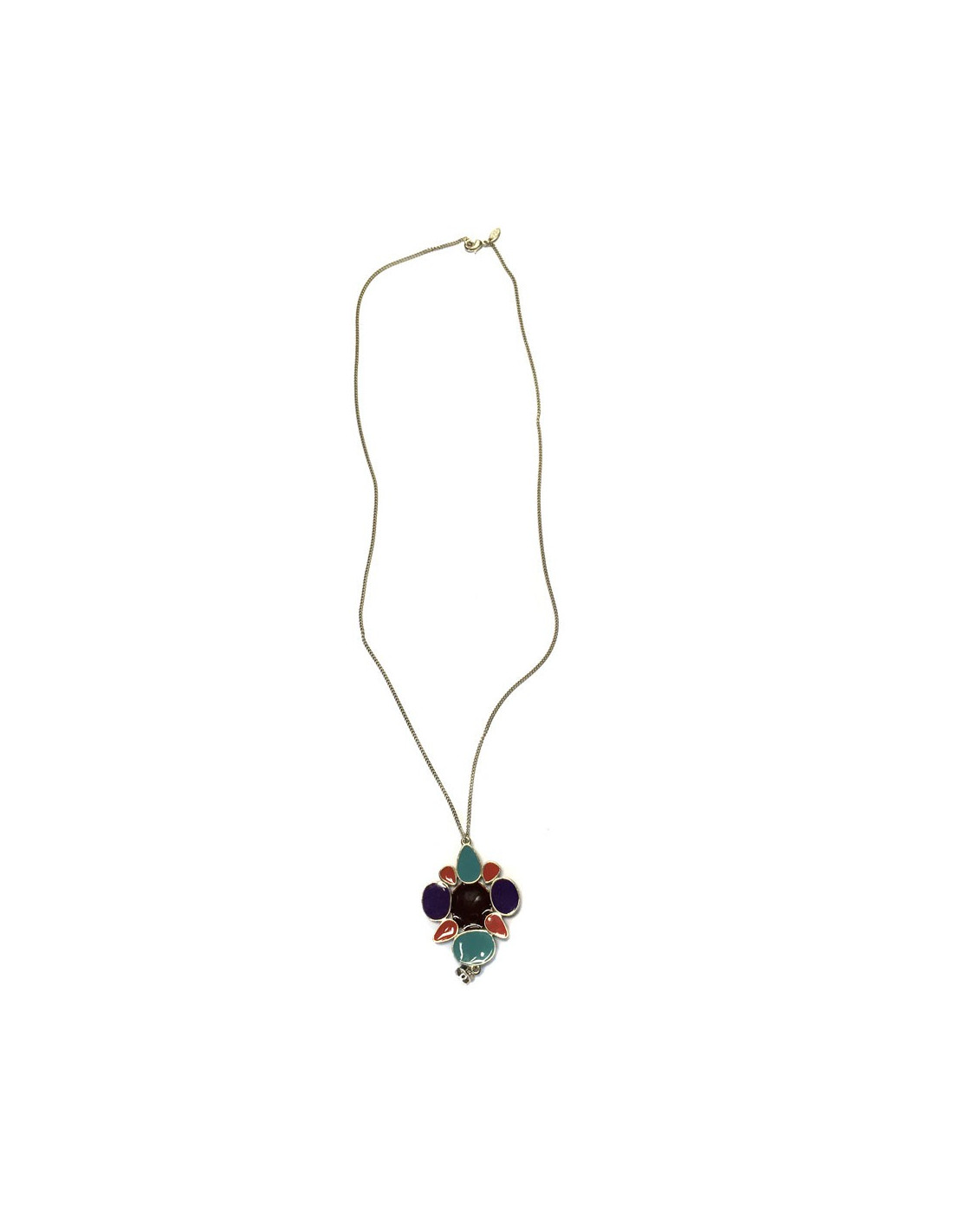 Collier Chanel en métal émaillé or pâle multicolore : turquoise, brique, violet et marron. Un petit pendentif CC se trouve au bout du bijou.