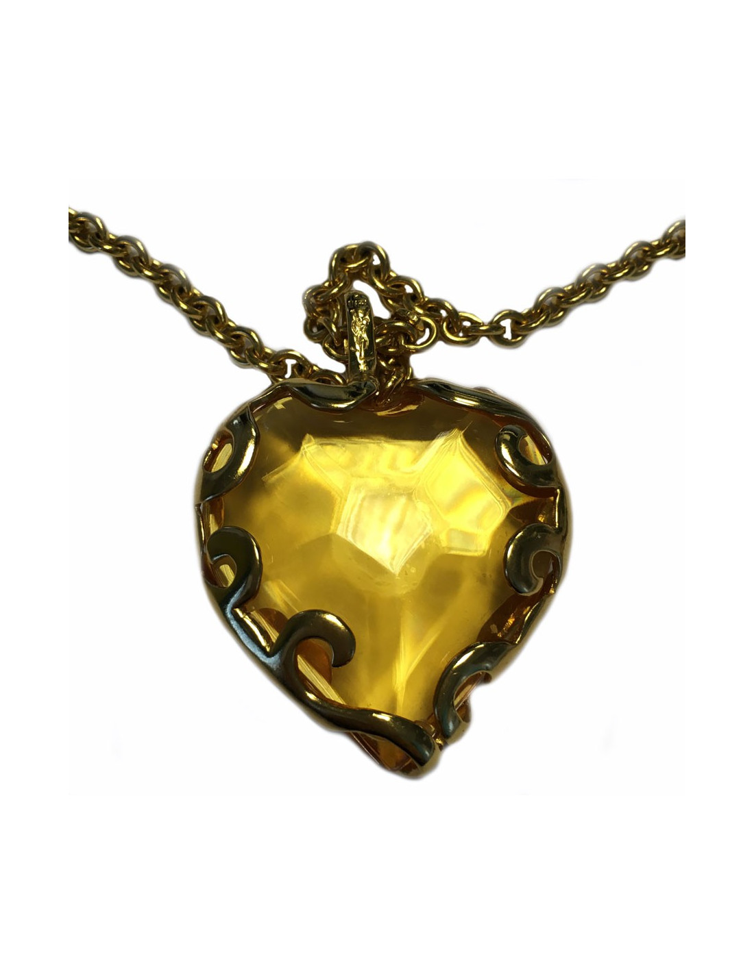 Collier coeur YVES SAINT LAURENT en métal doré. Le coeur est en plexi couleur ambre façon pierre facettée. Fermoir en T, coeur gravés YVES SAINT LAURENT, 3 longueurs disponibles. En très bon état.