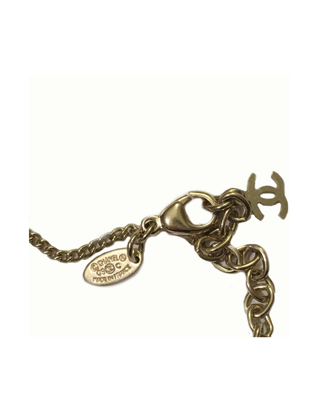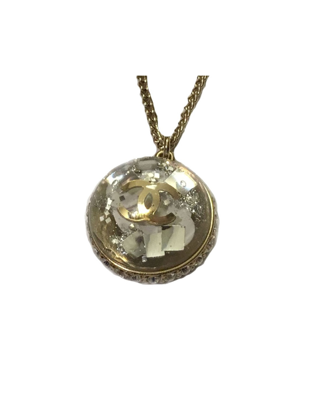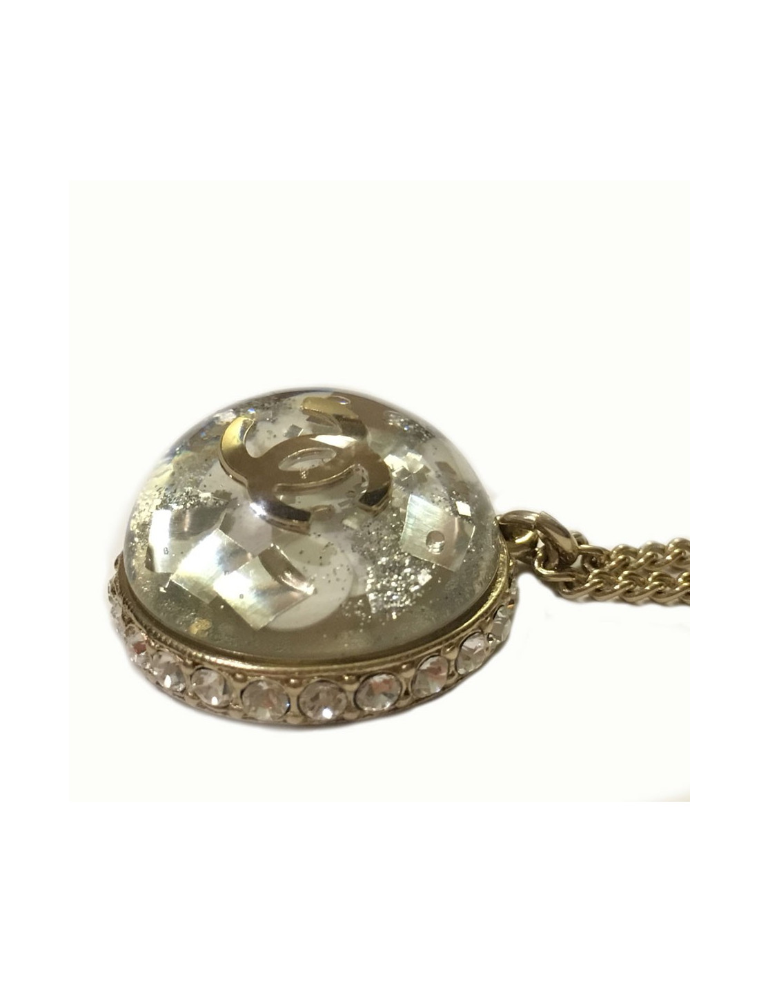 Collier Chanel pendentif et chaine, dans une demi-sphère en résine transparente, est enfermé un CC doré avec carrés et paillettes argentés, serti de strass. Jamais porté.