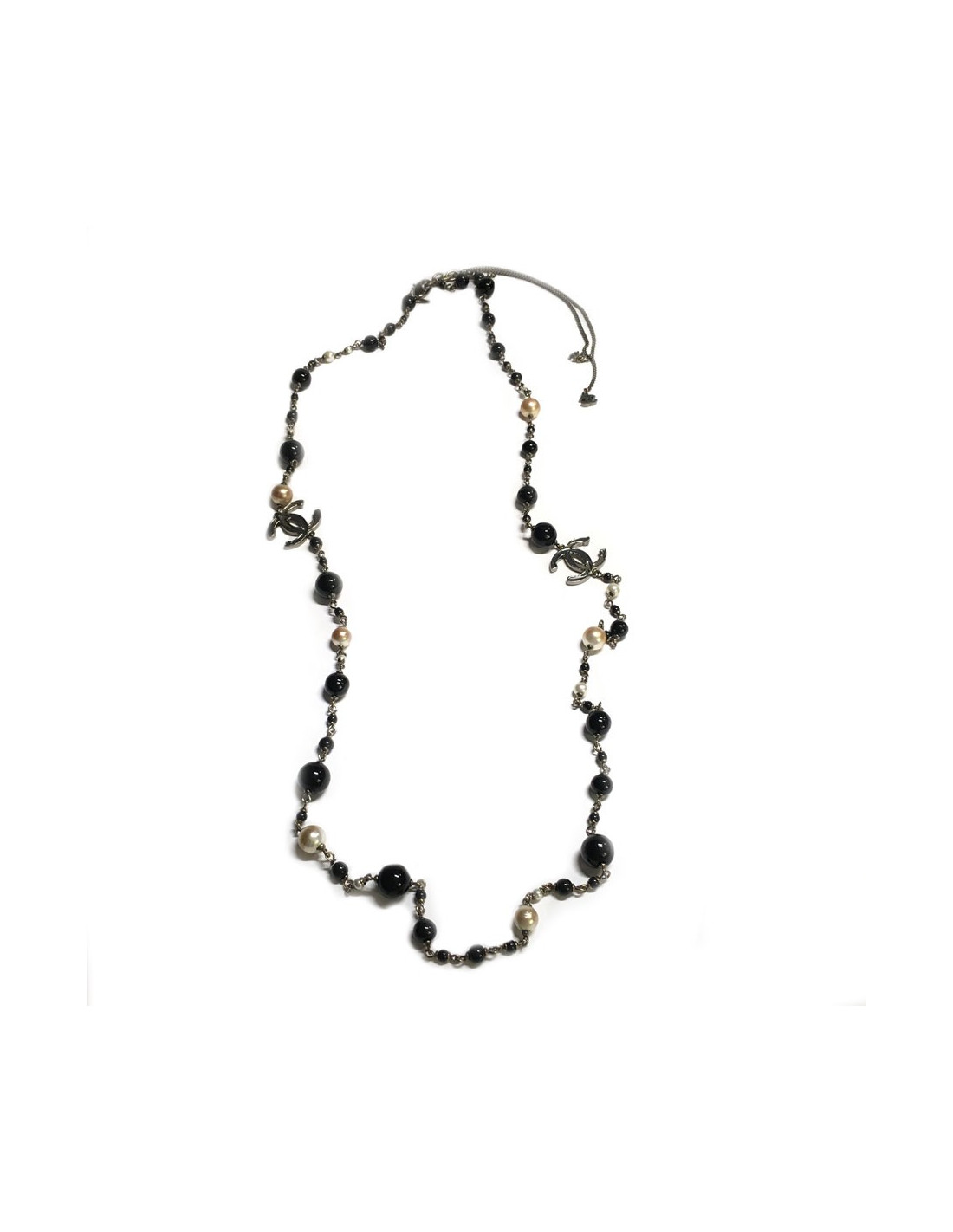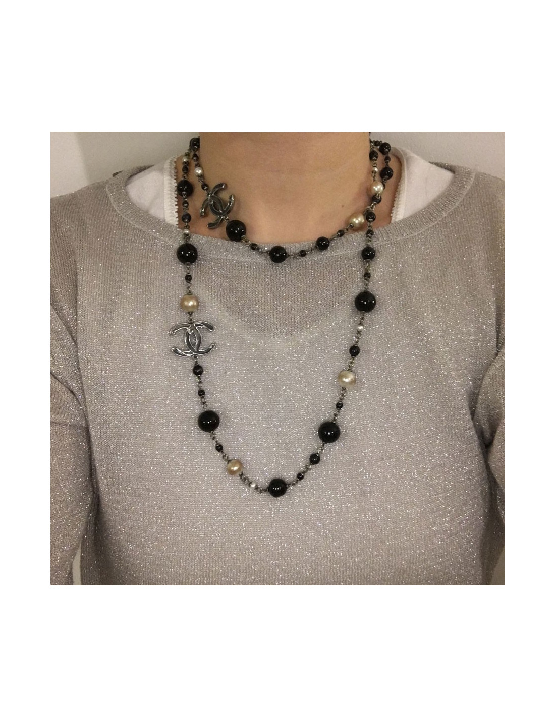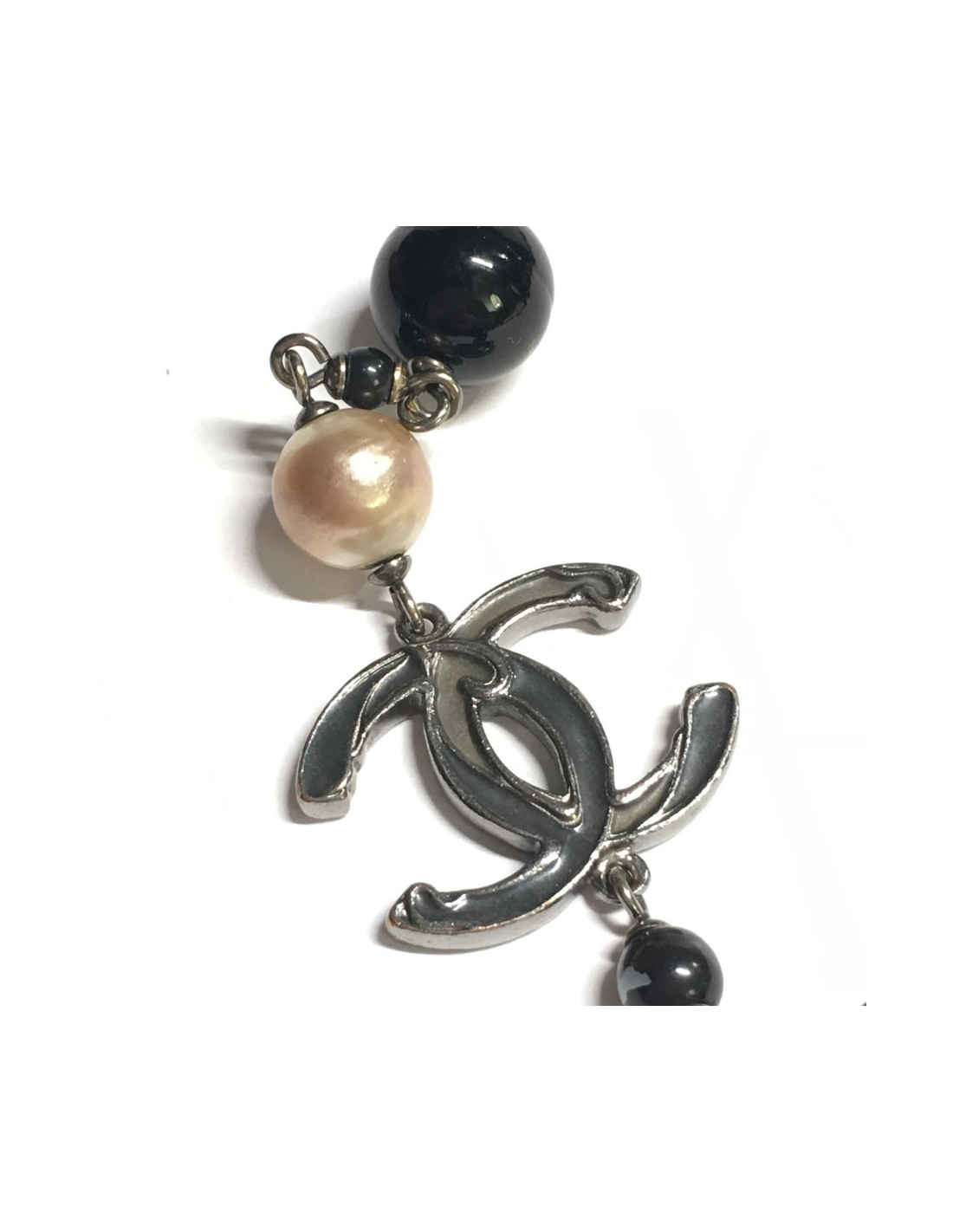 Sautoir CHANEL CC et perles noires, grises et nacrées