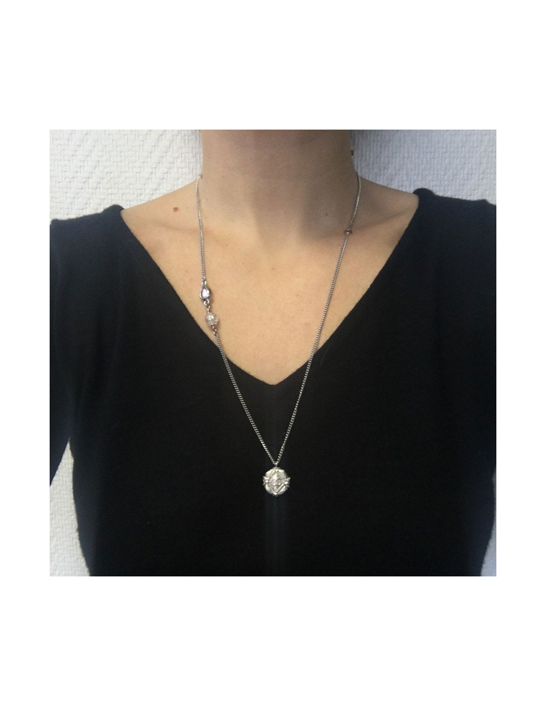 Collier CHANEL en métal argenté, pendentif rond avec un CC en son centre et 4 brillants. Perles transparentes et strass biseauté sur la chaîne. Jamais porté.