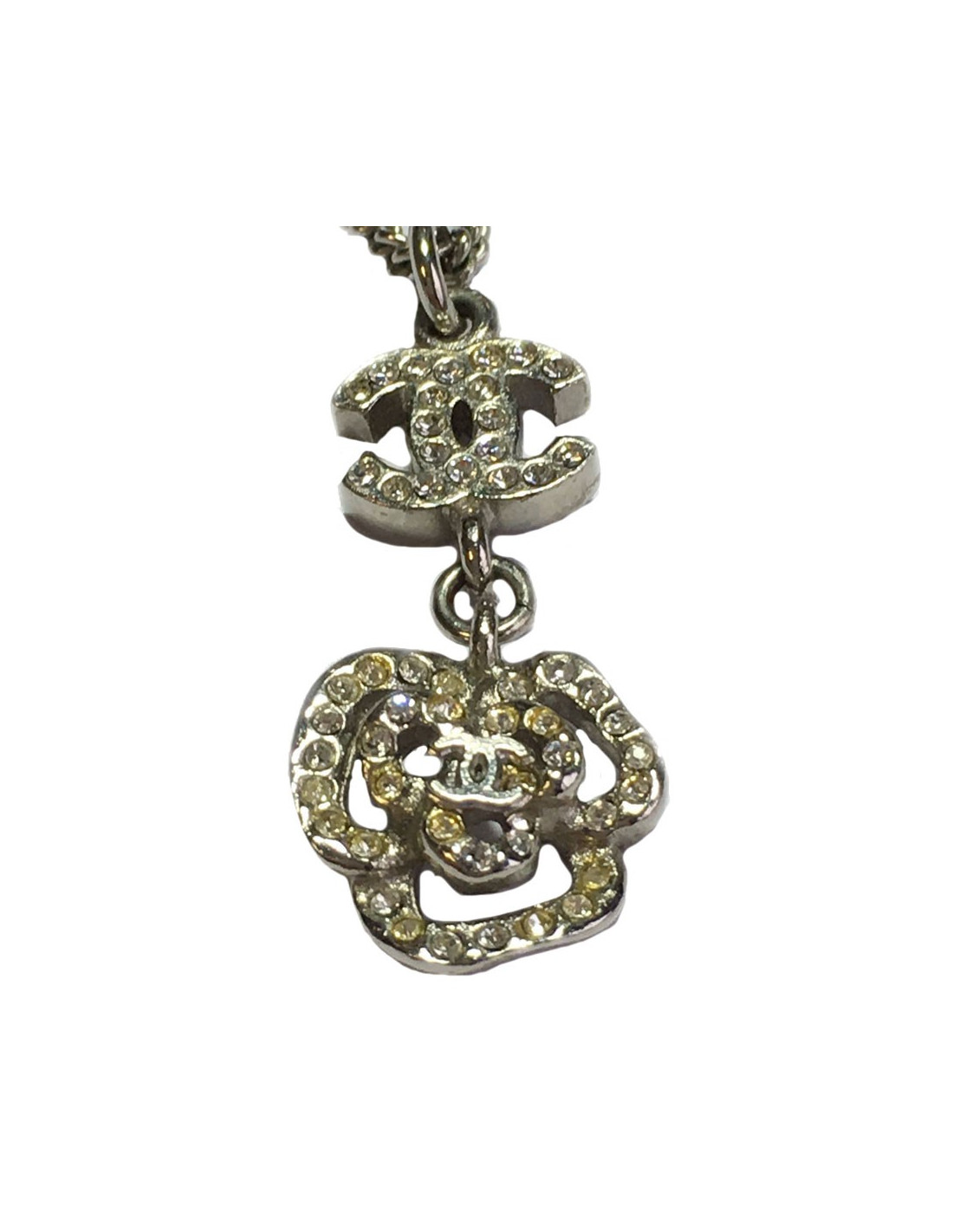Collier CHANEL en métal argenté et strass. Pendentifs camélia et CC ornés de strass. Petit CC argenté sur le camélia. Jamais porté. Absence de pastille de la marque.