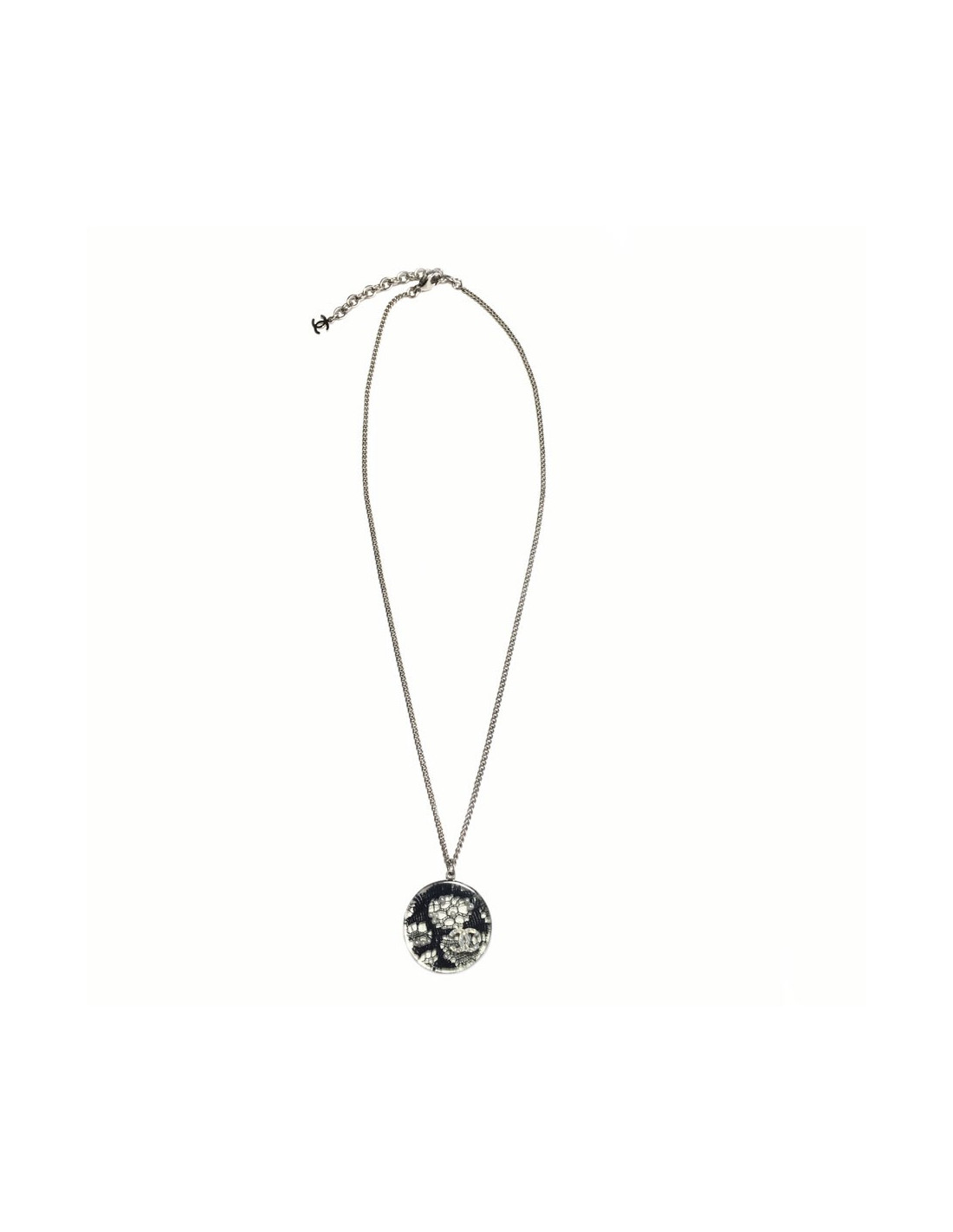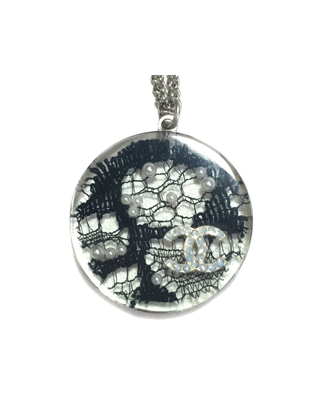 Collier CHANEL en plexi avec inclusion de dentelle et perles. Chaine en métal argenté. le tag n'est plus sur la chaîne.