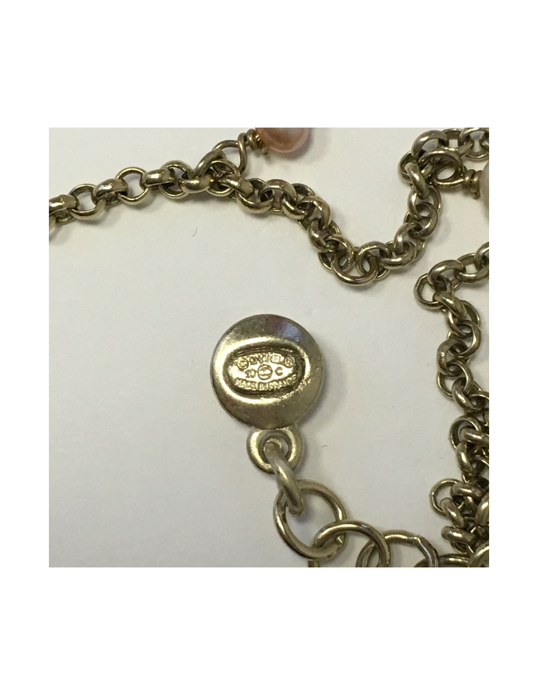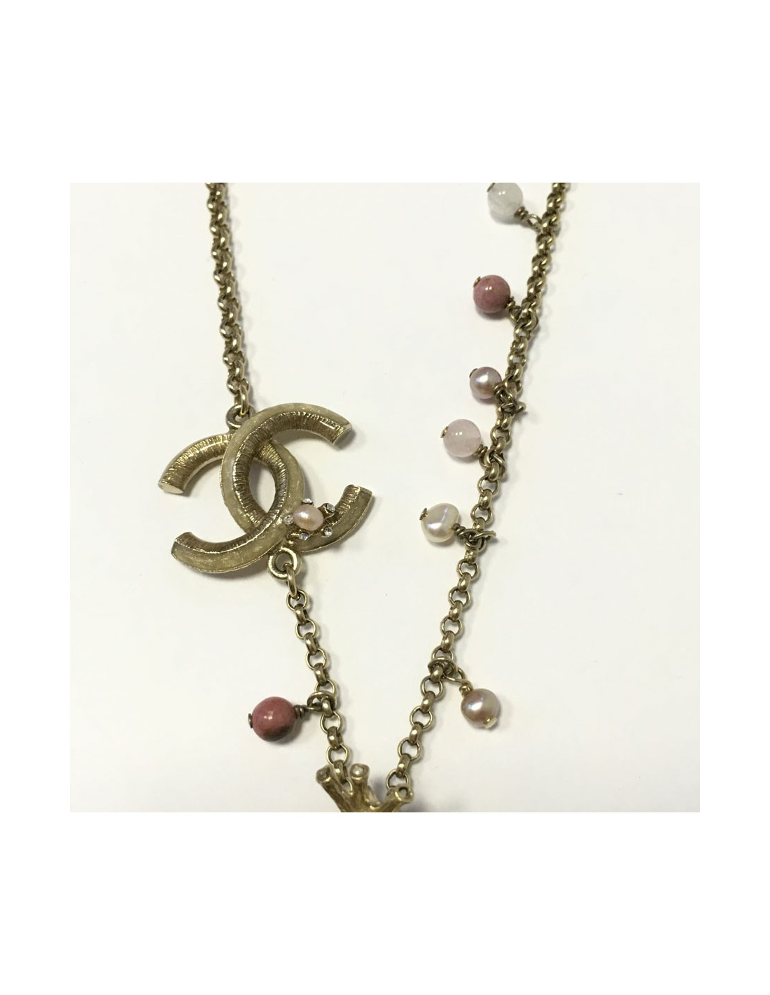 Très beau collier CHANEL en métal doré, pendentif fleur orné de strass et perles dans les tons roses. La chaîne est agrémentée d'un CC doré et de petites perles rosées, blanches et nacrées.