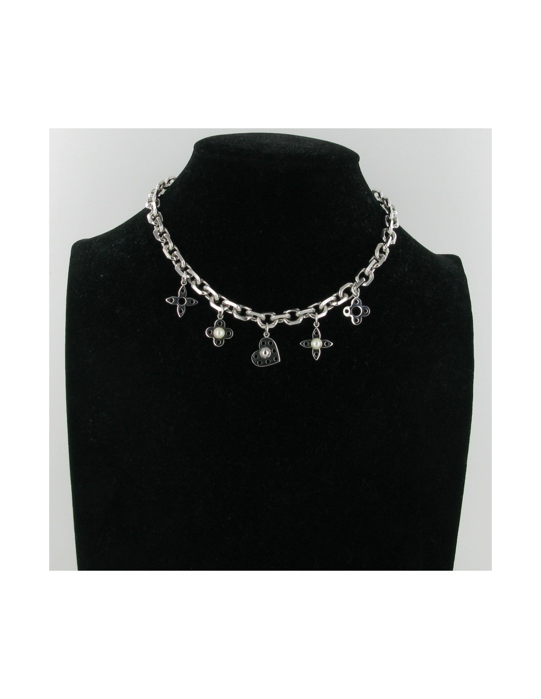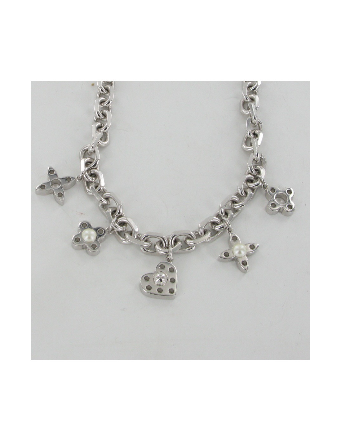 Espiègle, la ligne Hide & Sleek s'inspire de la délicate broderie anglaise utilisée par Marc Jacobs pour la collection Printemps/été 2012, qui révèle la peau au travers du motif brodé. Ce collier réglable se pare de breloques en forme de fleurs Monogram et d'un charm Art Déco orné des initiales LV sur le verso.