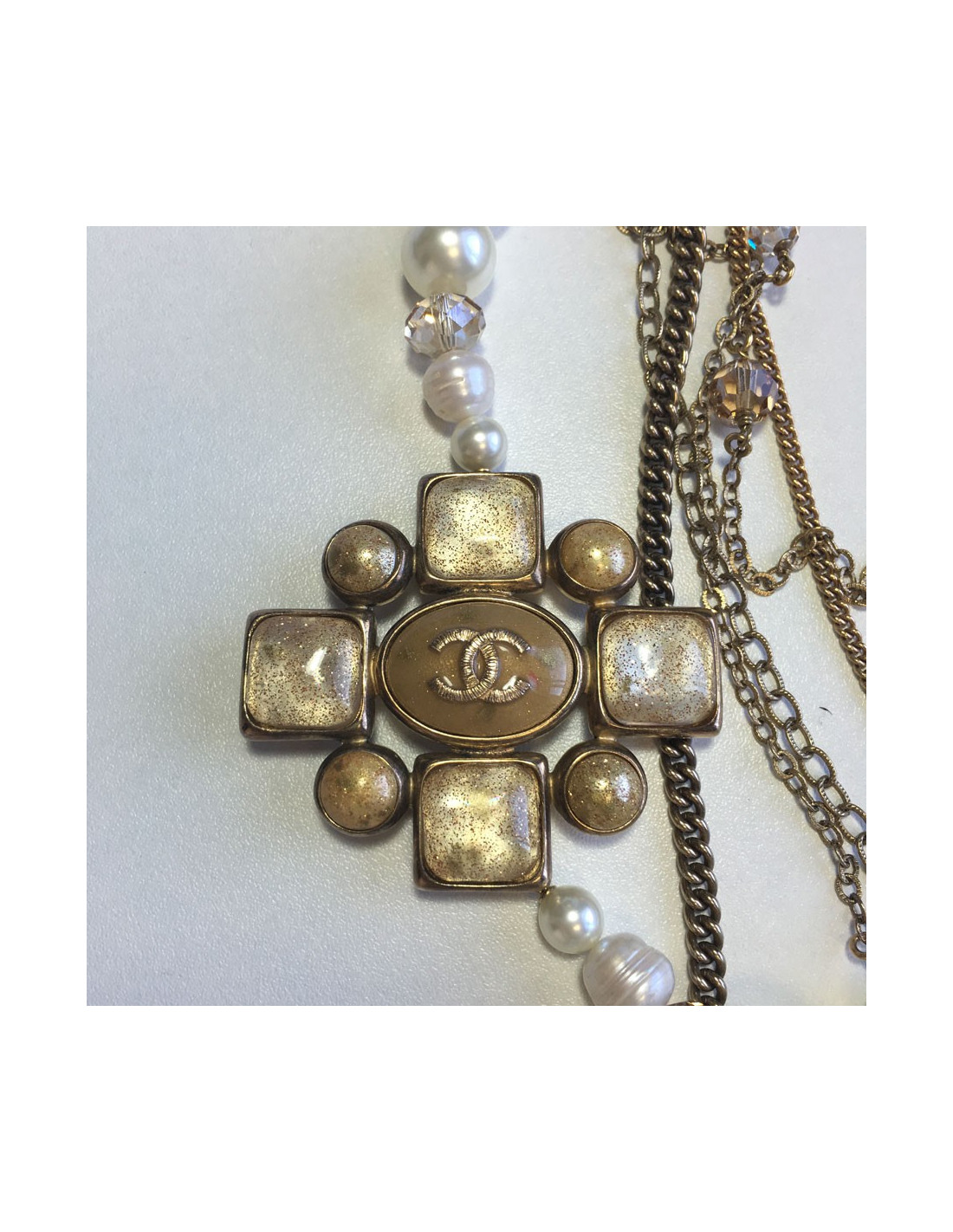 Magnifique collier CHANEL à multiples rangs de perles nacrées et perles d'eau douce, de chaines dorées et d'une pièce en métal doré, résine pailletée et CC.