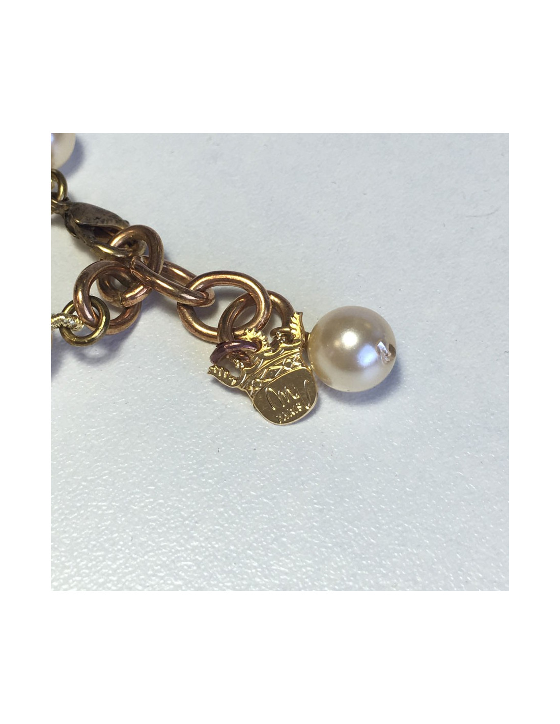 Collier MARGUERITE DE VALOIS en perles nacrées et fleurette en pâte de verre verte. Fermoir en métal doré. Pastille de la marque présente.