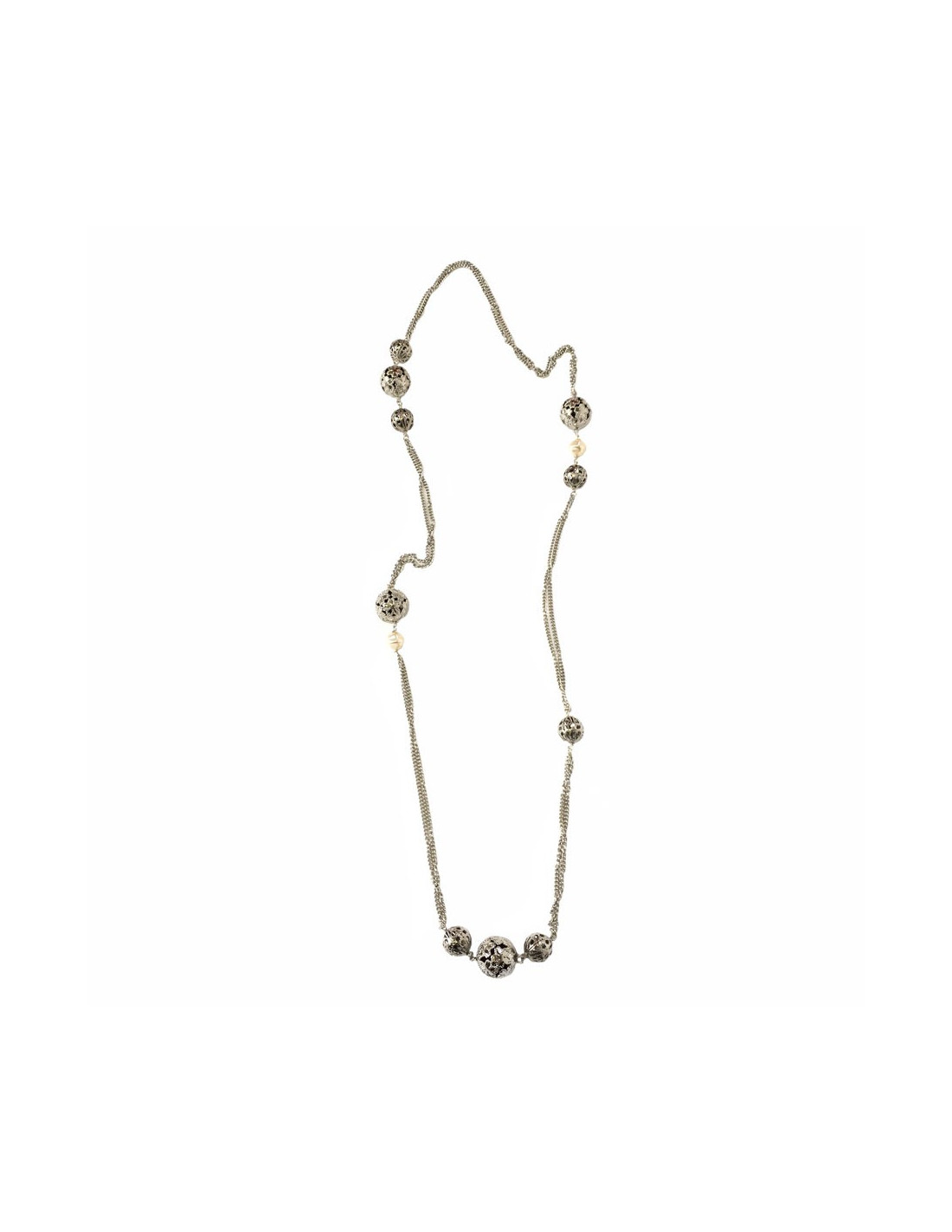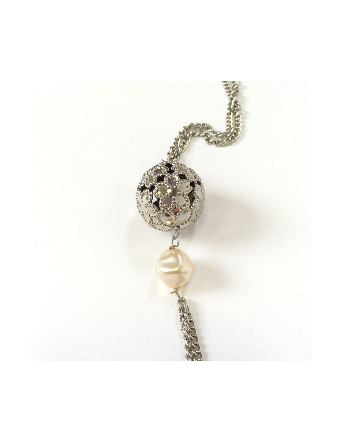Beau sautoir MARGUERITE DE VALOIS "sphère" en métal argenté. Double chaîne argentée, 2 perles nacrées et 10 sphères ajourées. Peut se porter en simple ou double rang.